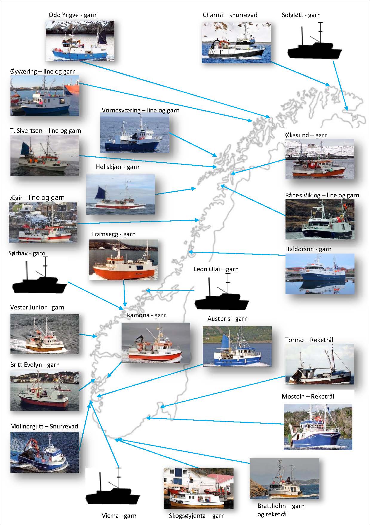 Figur 9.1 i vedlegget viser som et eksempel på deltakere i Kystreferanseflåten fra 2017. De deltakende fartøyene er instruert til å registrere hver dagsfangst i sin helhet. Dette inkluderer også data om bifangst og utkast. I tillegg til fangst, registreres også data som type og antall redskap, ståtid, fiskedybde og lokasjon. Beholdt fangst registreres i rund vekt per art og utkastet fangst registreres i antall per art. For hver art lengdemåles opptil 20 tilfeldig utvalgte individer hver uke, fra hver gruppe av både beholdt og utkastet fangst.