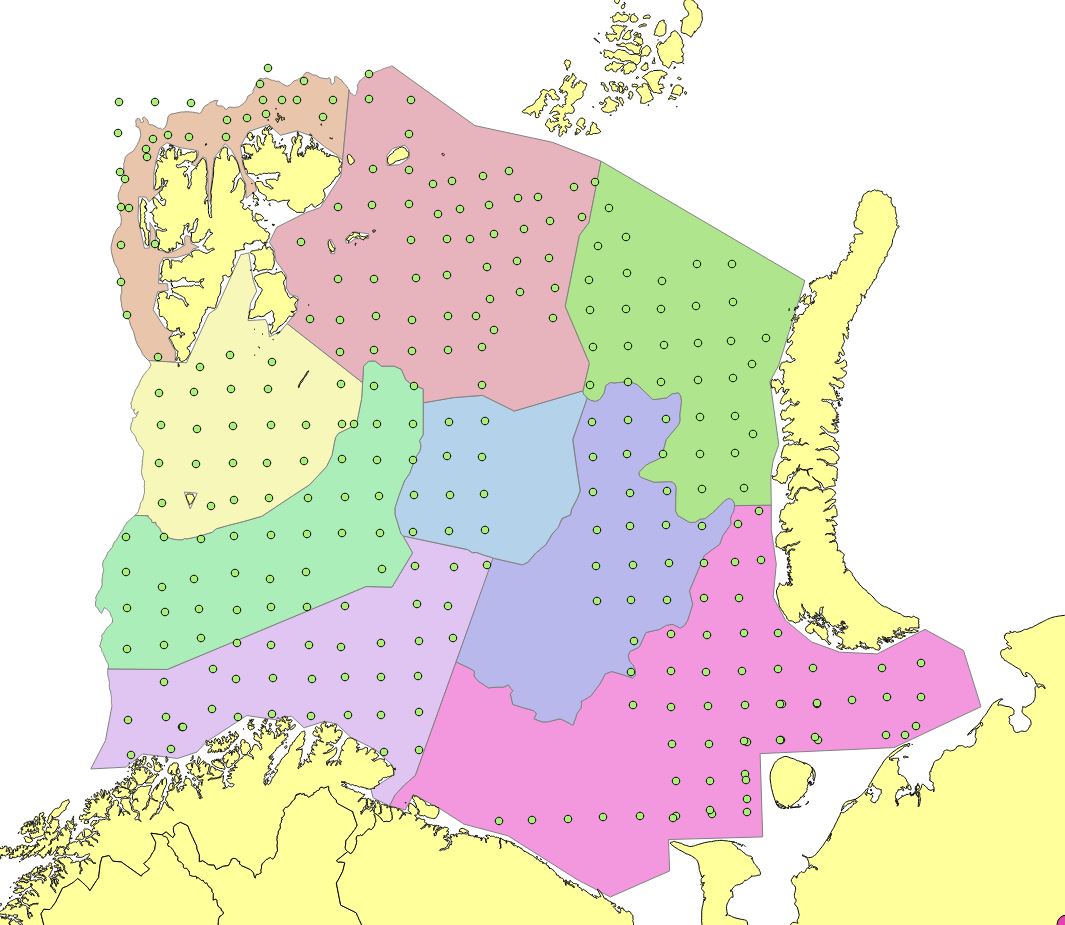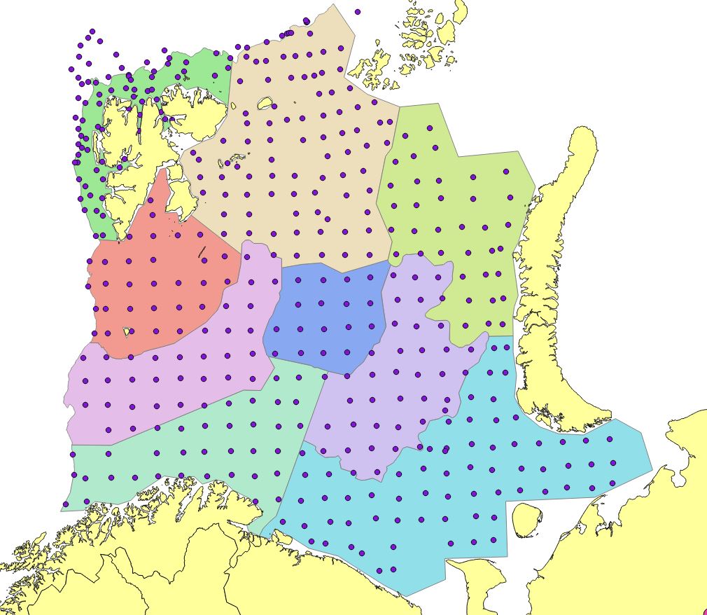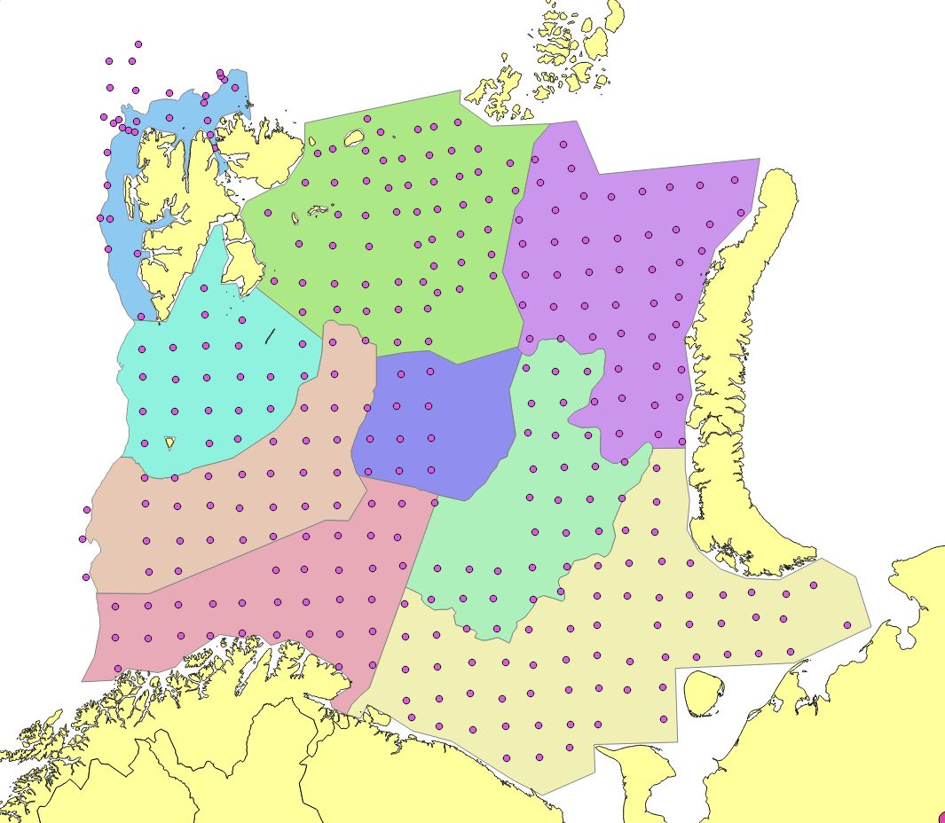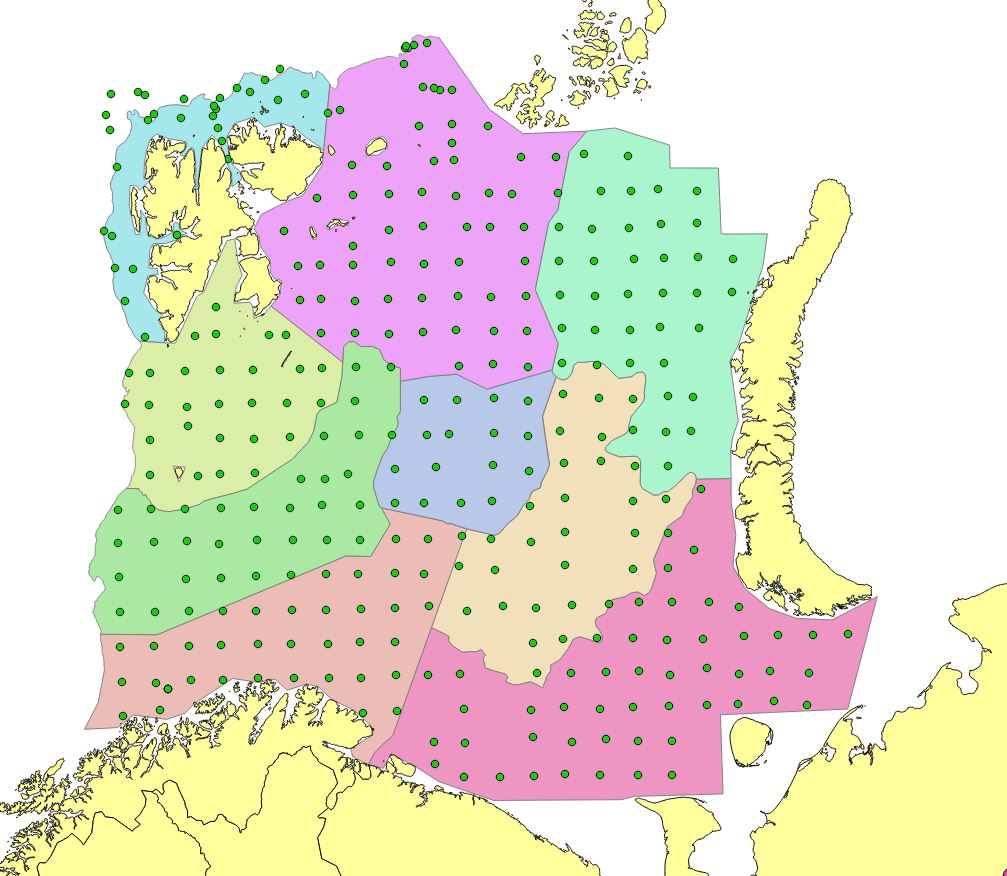 Appendix Figure 7. 2010. Stations set out in a modified UTM with approximately 35 nautical mile grid station distance. Reduction of the northern edges due to limited survey coverage. Russian investigations in Kara Sea (North east) not included in StoX calculations.