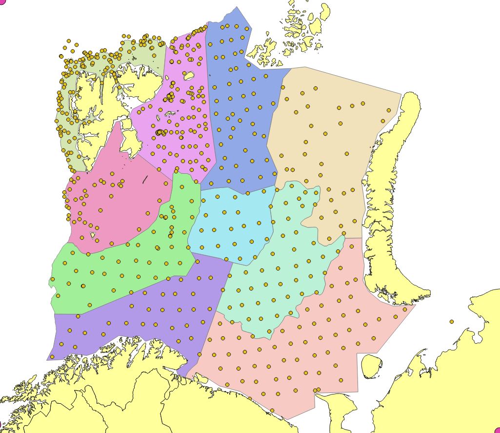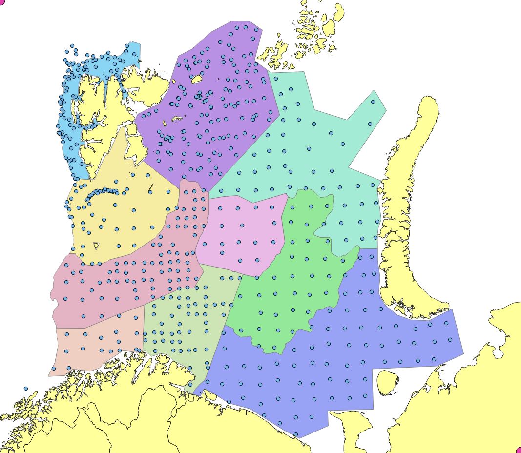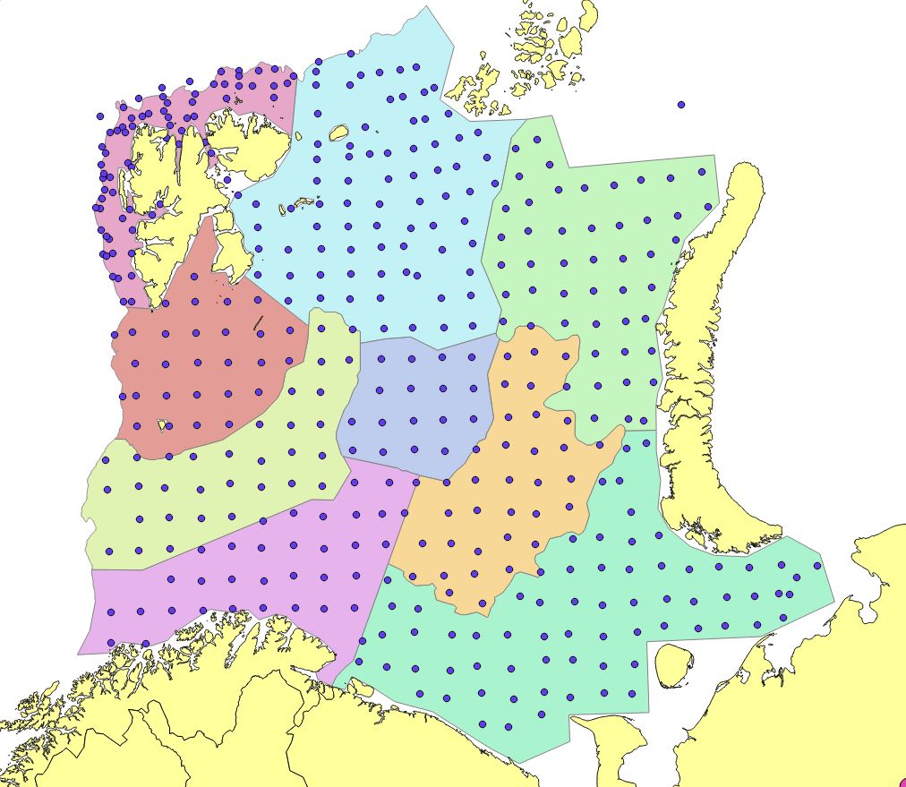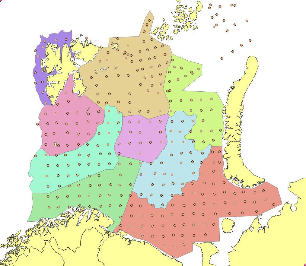 Appendix Figure 7. 2010. Stations set out in a modified UTM with approximately 35 nautical mile grid station distance. Reduction of the northern edges due to limited survey coverage. Russian investigations in Kara Sea (North east) not included in StoX calculations.