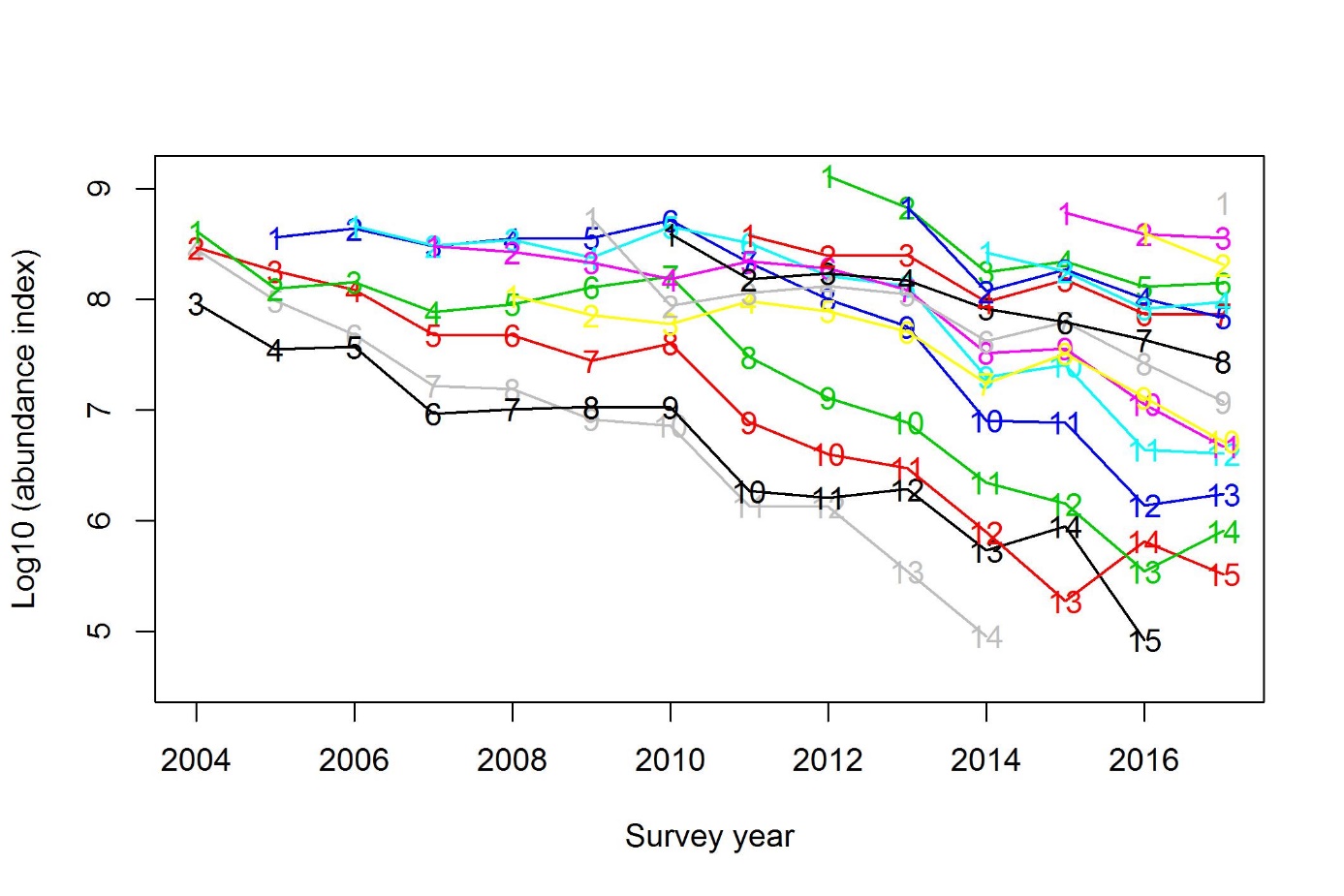Figure 2. Log abundance of cod (individuals), swpet area estimates from the Barents Sea Ecosystem Survey. Each line represent a cohort, first cohort the 2000-cohort, last cohort 2016. The numbers correspond to age (1-15).