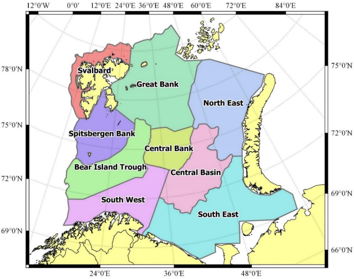 The 250 m depth contour was used as guideline for the borders between strata, as a preliminary analysis show that this depth separates quite well between low (deeper) and high-density (shallower) areas for cod and haddock. The 500 m depth contour was used as a limit for the strata system towards the Norwegian Sea in the West and the Polar Ocean to the North as the densities of cod and haddock at greater depths are very low. The southernmost strata were divided by the border separating the Russian-Norwegian Exclusive zones, since the survey effort varied between Russian and Norwegian vessels in this area some years.