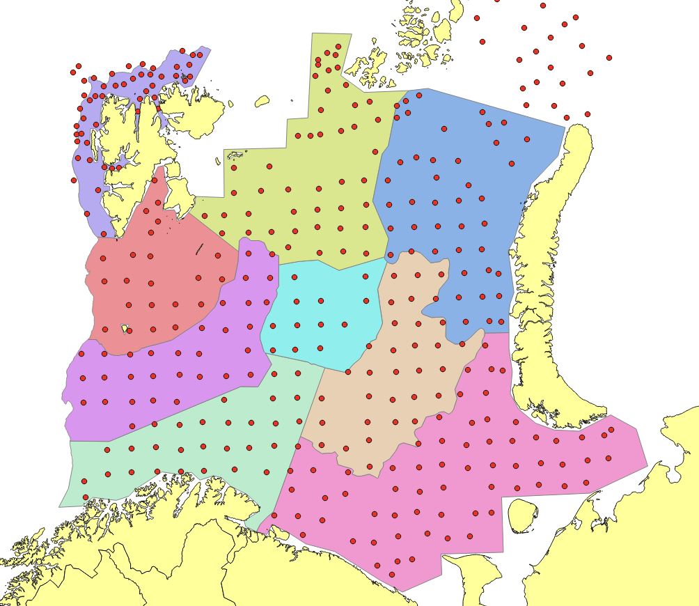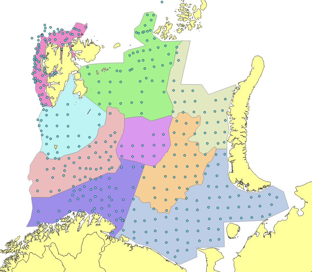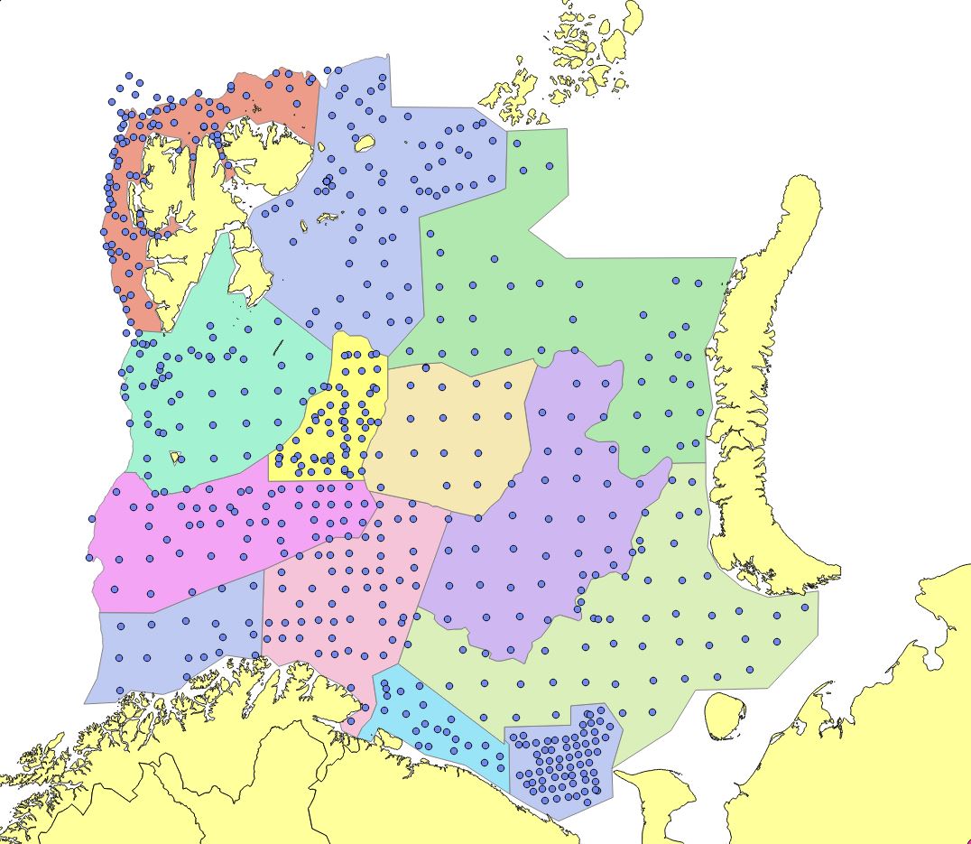 The result is a basic strata system that served as a starting point when generating the yearly strata systems used for estimation (Figure 1), modified to account for irregular sampling, ice hindrance, and limited survey coverage due to other reasons (Appendix Figures 1-15). The size of the strata was defined so that each stratum ideally contained at least 20 trawl hauls (although difficult to satisfy some years). We also modified the basic strata system to account for area specific differences in station density, since if not, areas with denser station coverage grid will be given more weight when calculating totals for the whole area.