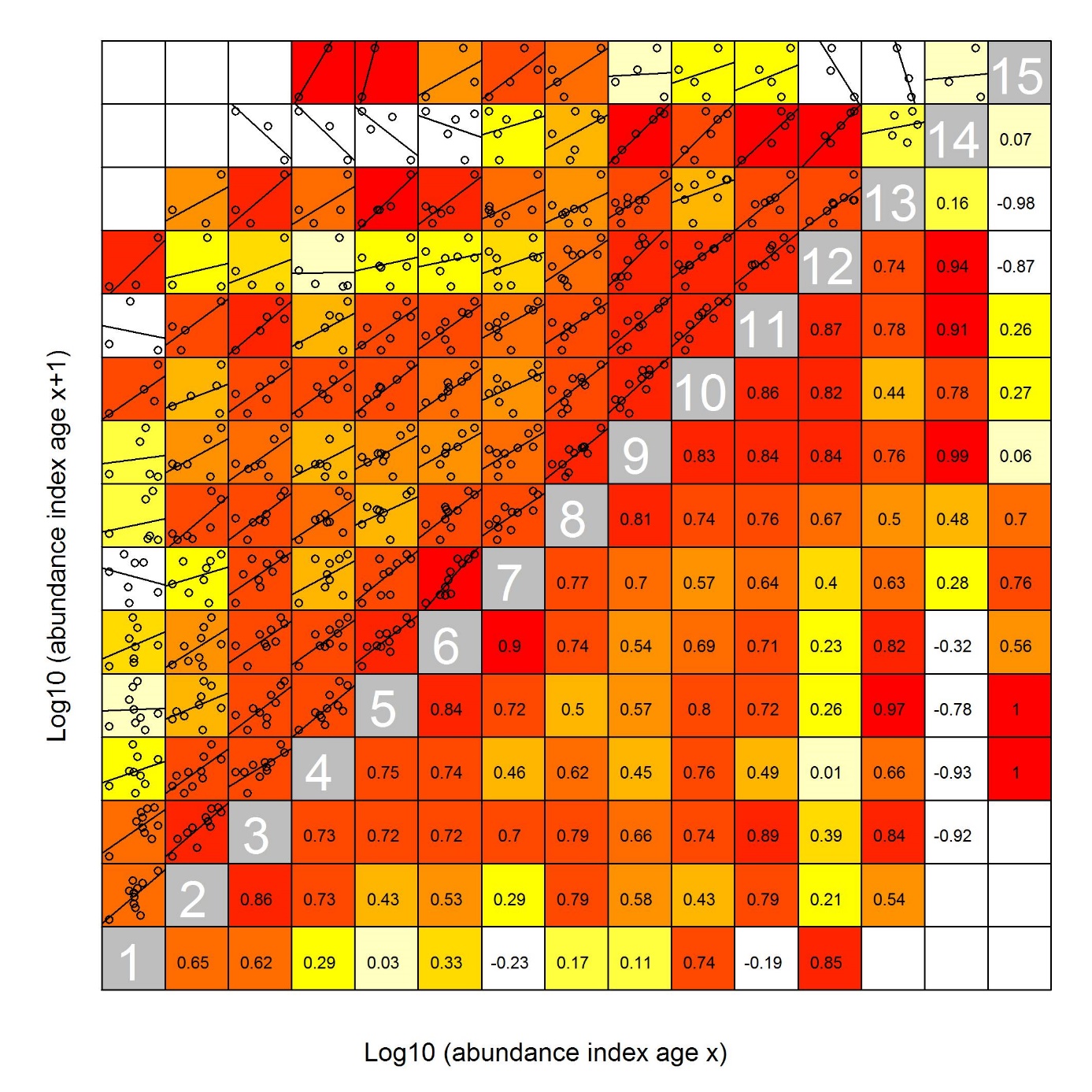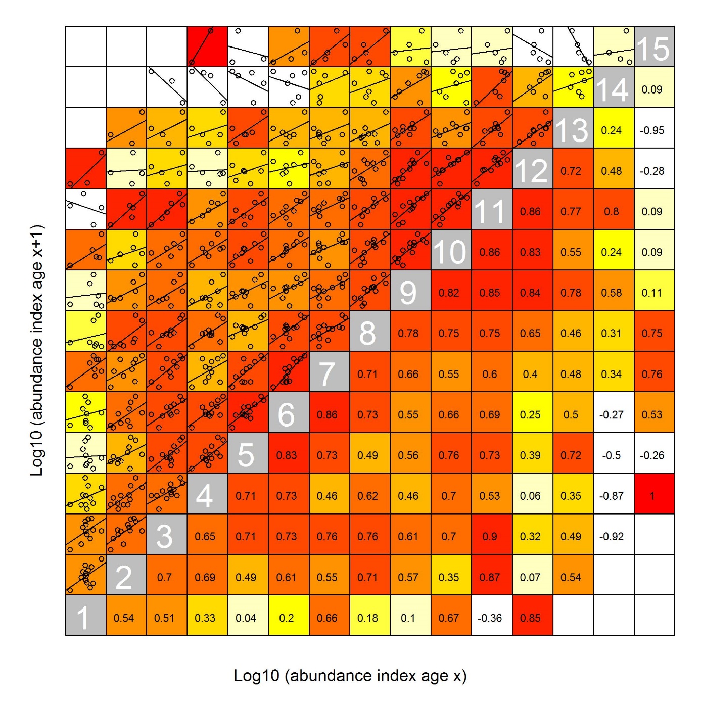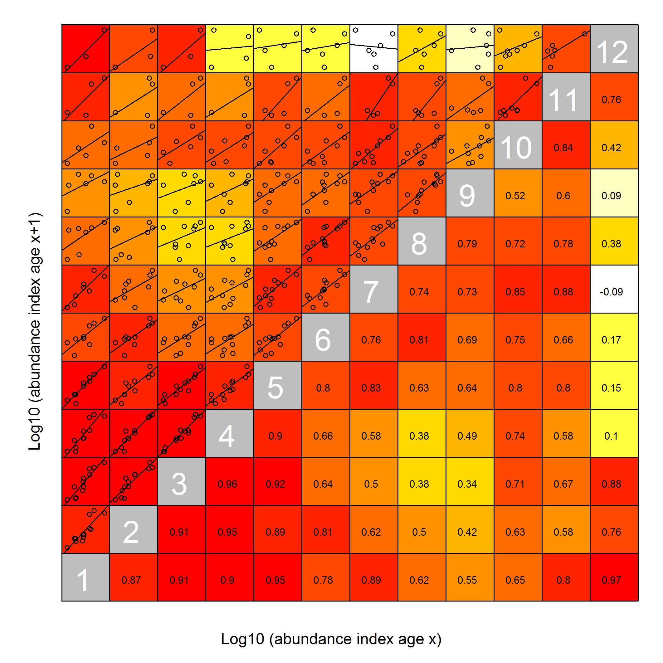 Consistency was quantified here as the correlation between the log abundance of all cohorts at age a in year y with the log abundances of the same cohort at older ages and later years. It is most common to consider only the correlation between the abundance of the cohorts at age a in year y, with the abundance at age a+1 in y+1, but here we present the correlations for the cohorts at all ages.