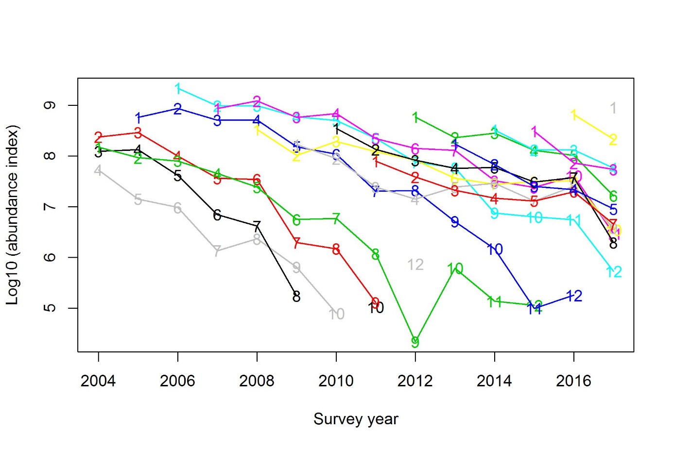 Figure 3. Log abundance haddock (individuals), swept area estimates from the Barents Sea Ecosystem Survey. Each line represent a cohort, first cohort the 2000-cohort, last cohort 2016. The numbers on the lines are the ages from 1 to 12. The dip at age 9 in 2012 might be caused by errors in age reading e.g. misreading haddock age 9 as haddock age 8 or 10. Age 9 in 2012 is from a weak cohort, and the uncertainty is high (see Table 7). Also note the upwards jump for many age classes in 2016, a year with lack of coverage in central/eastern Barents Sea.