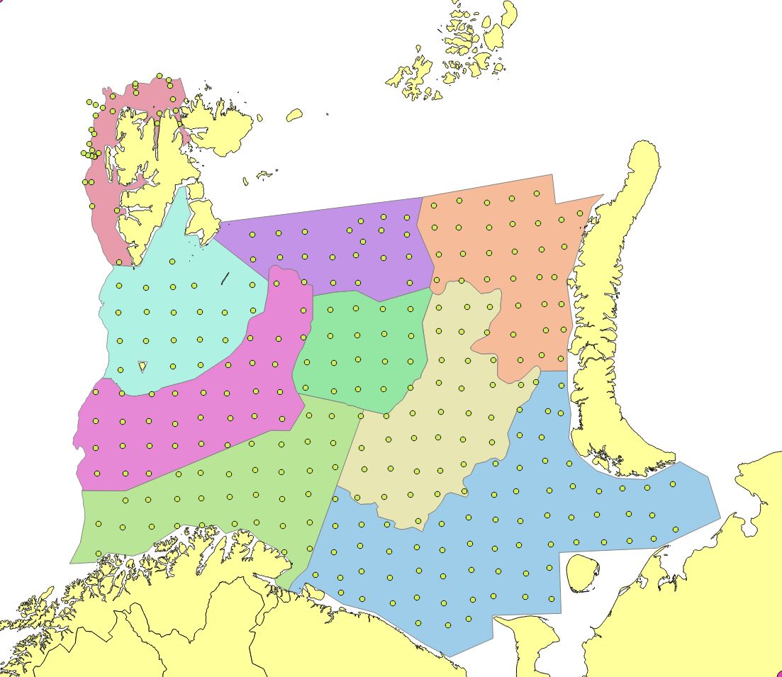 Appendix Figure 9. 2012. Stations set out in a modified UTM with approximately 35 nautical mile grid station distance, except around Svalbard. Denser grid west of Svalbard due to steep depth gradients. Reduction of the north-eastern edges due to limited survey coverage. Russian investigations in Kara Sea (North east) not included in StoX calculations.
