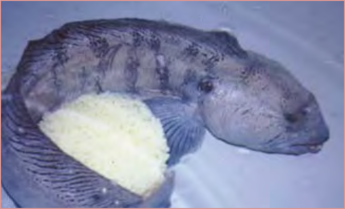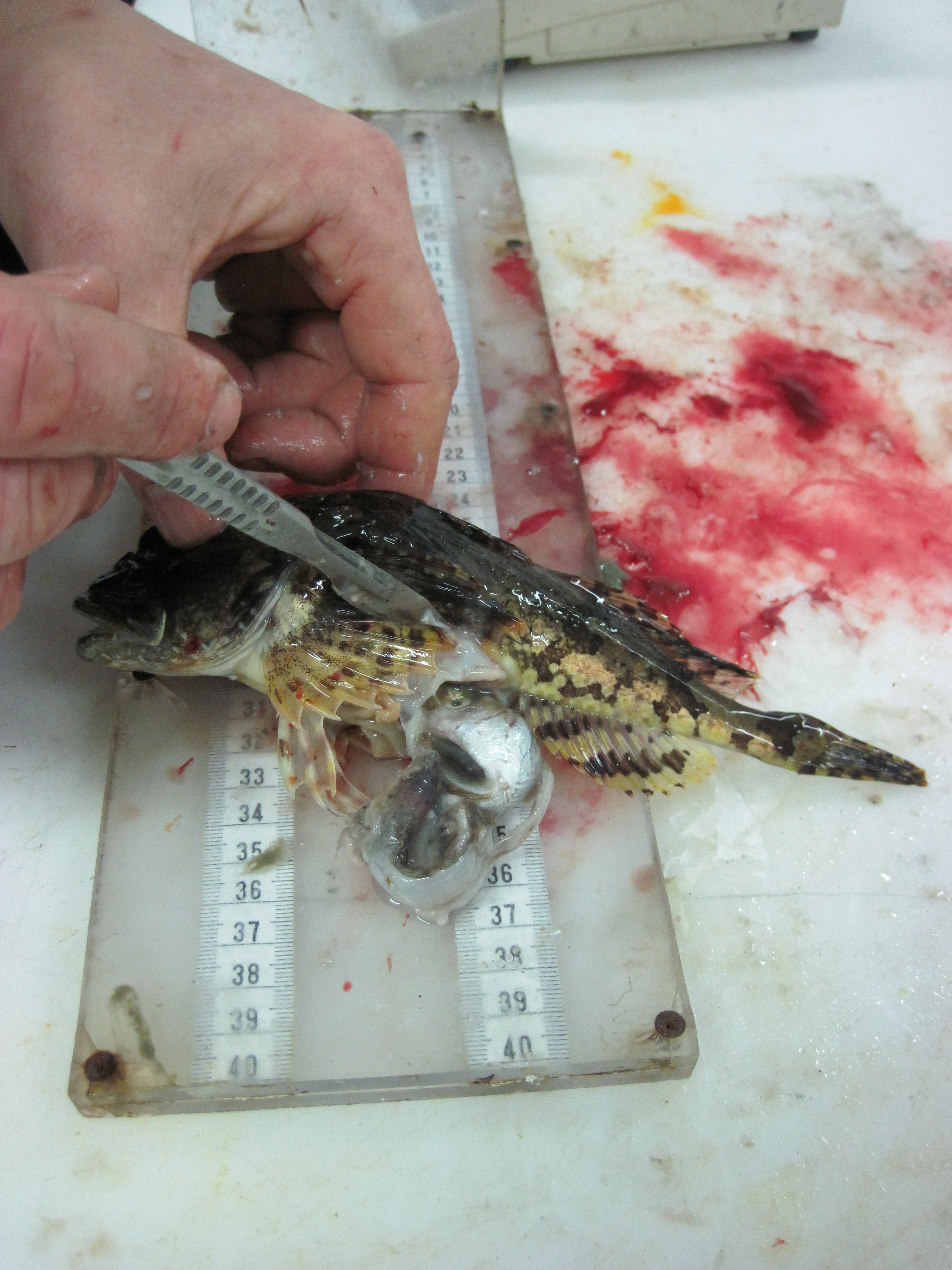 Figur 6. Øverst: Tråltrekk fra Scotian Shelf utenfor østkysten av Canada. Det er minst seks ulker i fangsten. Bildet hentet fra (Fisher et al., 2010). Nederst: Torskeyngel dissekert ut av en ulkemage fra Porsangerfjorden. Er ulka en undervurdert yngelpredator?