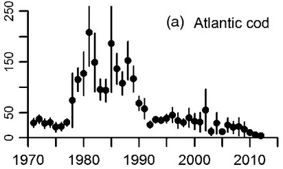 Olsen EM, Heino M, Lilly GR, Morgan MJ, Brattey J, Ernande B, Dieckmann U. 2004. Maturation trends indicative of rapid evolution preceded the collapse of northern cod. Nature 428:932.
