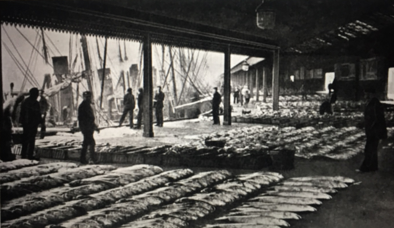 Figur 4. Eksempel på tidligere tiders forekomst av storfisk hentet fra Aberdeen fiskemarked på Scotlands nordsjøside på begynnelsen av 1900-tallet. Som i Porsangerfjorden ble det typisk landet mye større individer enn i dag. Bildet er hentet fra Roberts (2010).