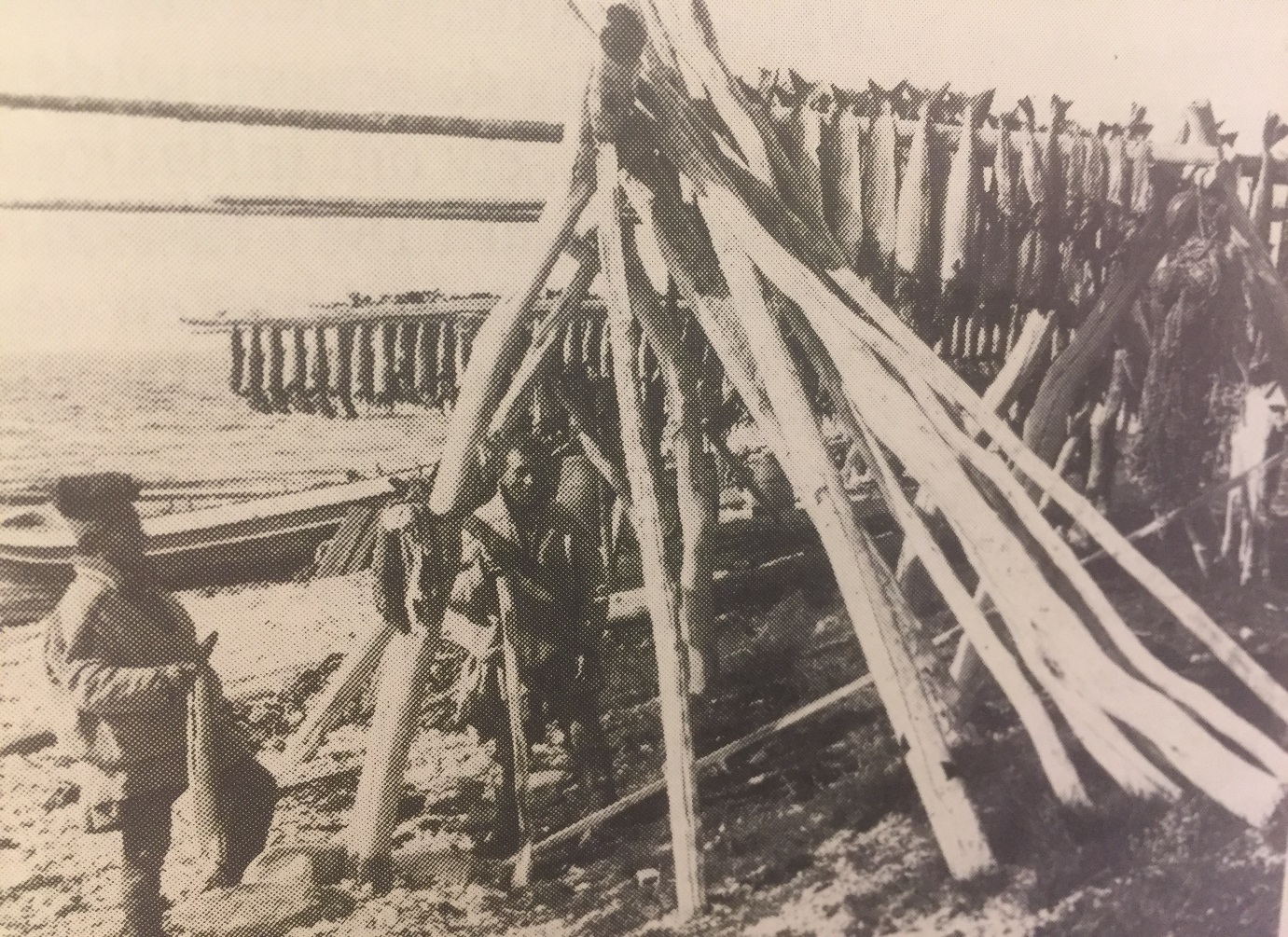 Figur 3. Sommerfiske etter sei ved Ytre Kjerringvik i Porsanger rundt begynnelsen av 1900-tallet. Mye stor sei ble tatt i dette fiskeriet og fisket var årvisst fram til rundt 1980. Det ble også fisket mye stor sild høst og vinter. Bildet hentet fra Hanssen (1986)