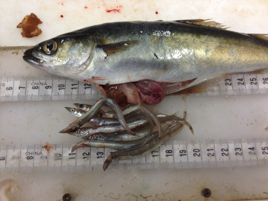 Da torsken forsvant fra de boreale og tempererte delene av de canadiske bankene, økte biomassen av de pelagiske byttedyrene lodde (Mallotus villosus), tobis (Ammodytes sp.) og reker (Pandalus sp.), og den økte filtreringskapasiteten disse artene representerer når biomassen øker, bidro muligens til å beite ned egg og larver hos torsk, slik at sistnevnte ikke produserte nok rekrutter, tross fiskeforbud (Steneck, 2012; Collie et al., 2013). Fra Nordsjøen og Østersjøen er det vist at filterspisere som ungsild og brisling kan konsumere betydelige mengder egg og larver fra torsk og rødspette (Daan et al., 1985; Koster and Mollmann, 2000; Segers et al., 2007). Det er også foreslått at økte sildeforekomster, som følge av reduserte torskebestander, i Nordsjøen beiter på torskeegg og -larver, og i tillegg torskelarvenes foretrukne byttedyr raudåte, i en slik grad at det hindrer gjenoppbygging av torskebestanden (Fauchald, 2010). Ironisk nok kan altså torskens foretrukne byttedyr holde sin viktigste predator i sjakk ved å spise opp avkommet dens, og redusere tilgangen på mat for de som overlever. I tillegg bidro veksten i pelagiske bestander til vekst i selbestanden, som også kunne bidra til å hindre den kollapsede torskebestanden i å reise seg igjen (Frank et al., 2005). Tilsvarende finner vi i de indre deler av Porsangerfjorden i dag rike rekeforekomster, og betydelige mengder overvintrende ungsild og lodde (Ramasco et al., 2017; Pedersen et al., 2018). Også tobis er vanlig forekommende i Porsangerfjorden, og representerer det viktigste byttedyret hos småsei opp til 34 cm fanget i grunne områder om høsten (Figur 5). Mens under 1 % av seien i våre undersøkelser hadde spist torsk- eller seiyngel, viste en undersøkelse av småsei fra kysten av Troms et betydelig inntak av torskeyngel (Aas, 2007).
