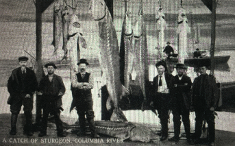 Figur 1. Stør går opp i elvene for å gyte og er der enkel å fange. Bestandene ble derfor fisket til kollaps tidligere enn bestander av torsk og sei, som tilbringer hele livssyklusen i det marine habitatet. Bildet er tatt på slutten av 1800-tallet ved Colombia River på østkysten av USA, mens fangstene fortsatt var gode. De fleste europeiske bestandene av stør ble utryddet allerede i middelalderen. Bildet er hentet fra Roberts (2010).