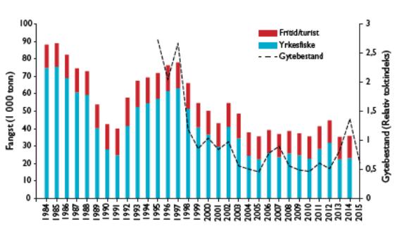 Figur 7. Kysttorskbestanden nord for 62. breddegrad fikk et kortvarig oppsving på begynnelsen av 1990-tallet, muligens forårsaket av invaderende grønlandssel. Figur hentet fra Havforskningsrapporten 2018 (www.hi.no).