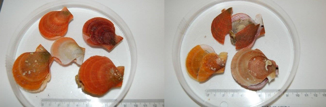 Bilde 2. Eksempler på skade på haneskjell fra Harvester, fått i oppsamlingsposer. Liten skade på bildet til venstre og dødelig skade til høyre. Foto: Maria Jenssen, Hi