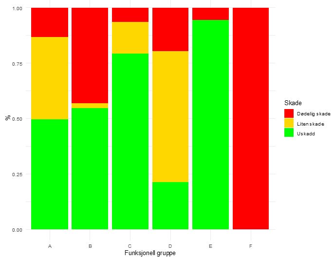 For å forenkle fremstillingen av resultatene fra skader på dyr i oppsamlingsposene, valgte vi å sortere dyrene i seks grupper basert på kriterier i forhold til mobilitet (fastsittende eller bevegelige), sårbarhet i forhold til fysisk påvirkning (skall eller annen beskyttelse) og rekrutteringspotensiale (hvor rask nyrekruttering) i henhold til tabell 4.