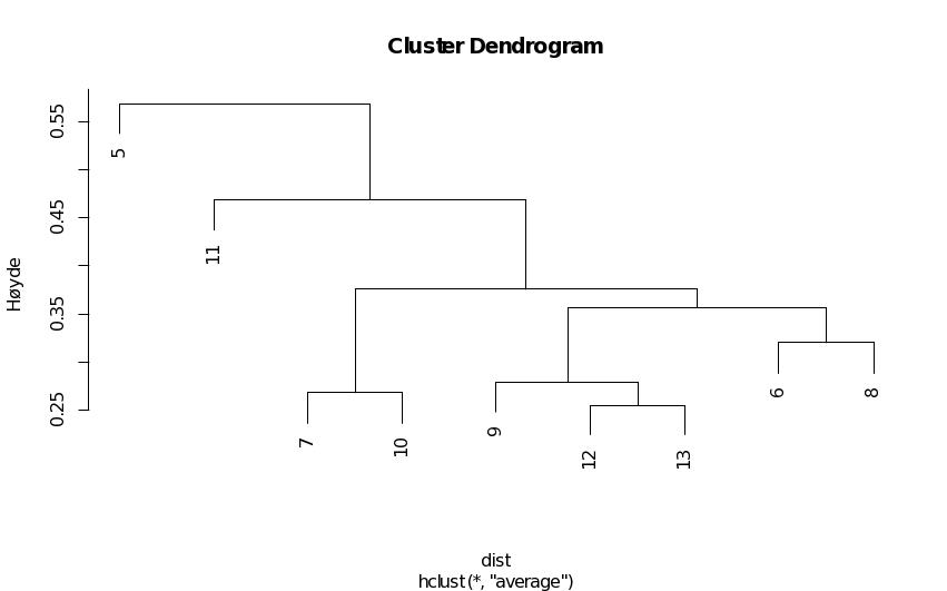 «Average linkage clustering» basert på en Bray Curtis «dissimilarity matrix» ble brukt for å vise ulikheten mellom prøvene. Prøver som er like i sammensetning vil ligge nært hverandre og danne klynger, mens prøver som er ulike vil ligge lenger fra hverandre. Avstanden mellom klynger er definert som gjennomsnittlig avstand mellom alle inter-klyngepar.