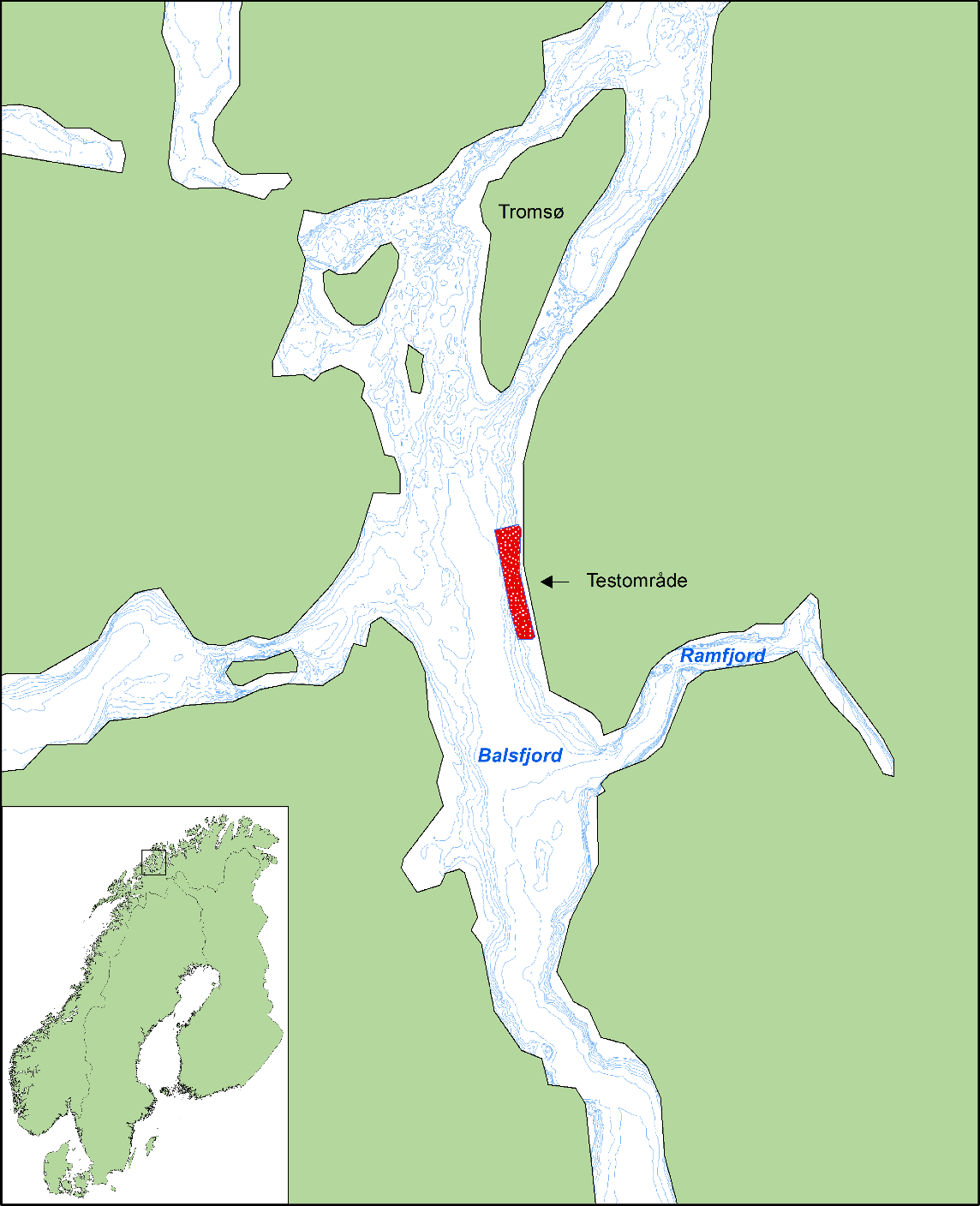 Figur 1. Oversiktskart som viser omtrentlig beliggenhet av testområdet med Harvester ved Berg i Balsfjord