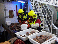 Bilde 1. Sortering av materiale fra trekantskrape på dekk. Foto: Eivind Oug, NIVA