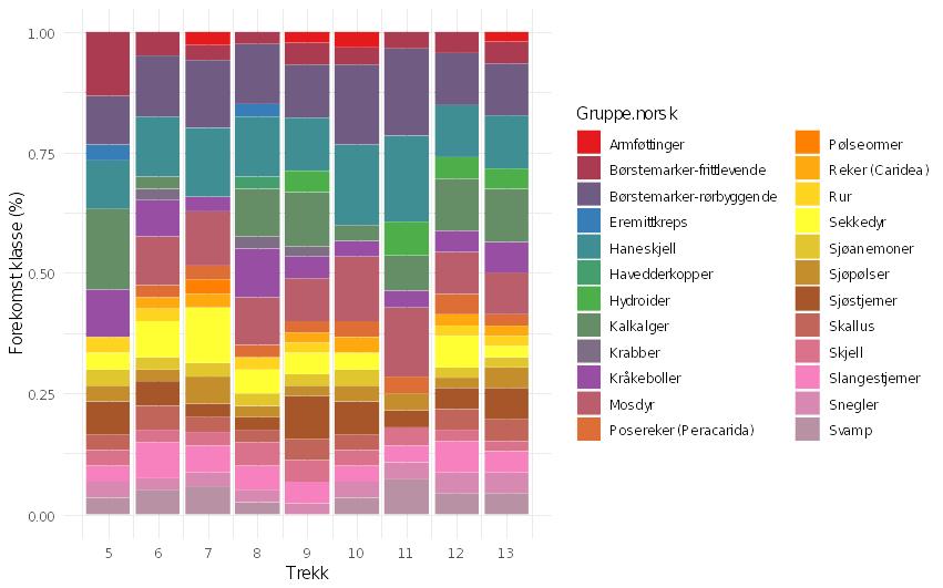 Figur 2. Viser den relative fordelingen av dyregrupper og dominerende arter (med norske betegnelser) basert på mengdebestemmelsene (forekomstklasser eller antall individer), i trekanskrapeprøvene 5-13.