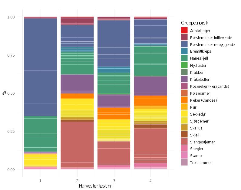 Det var ingen registrerte forskjeller i artsrikhet mellom prøvene tatt på testområdet før Harvester (trekk 5-8) og etter testene med Harvester (trekk 9-13). Hovedforskjellen mellom skrapeprøvene syntes å være relatert til prøvevolum, altså hvor mye materiale skrapen har samlet i de enkelte trekkene. Prøvene med lavest volum (trekk 5 og 11) hadde for de fleste artsgruppene færre arter enn fulle skraper (40-50 liter).