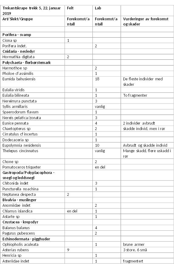 Prøvene med trekantskrape var artsrike og viste at det var et normalt og godt utviklet økosystem på haneskjellfeltet ved Berg. I Tabell 5 er det gitt en oversikt over artsinnholdet for de viktigste gruppene i hver av prøvene. Prøve 1- 4, som ble tatt utenfor testfeltet, er ikke fullstendig opparbeidet på grunn manglende tid. Flerbørstemark, bløtdyr og pigghuder var generelt de mest artsrike gruppene. En fullstendig oversikt over artsinnholdet og mengderegistreringene for artene i alle prøvene er gitt i Appendikstabell 1.