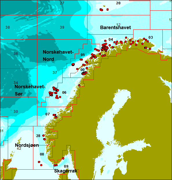 Figur 1. Prøvetakingsposisjoner (røde punkter) for hver enkelt kveite samlet inn i perioden oktober 2013 - mars 2016. Fiskeridirektoratets inndeling av havområdene i statistikkområder er angitt med røde linjer og nummer (svarte tall) på hvert statistikkområde.