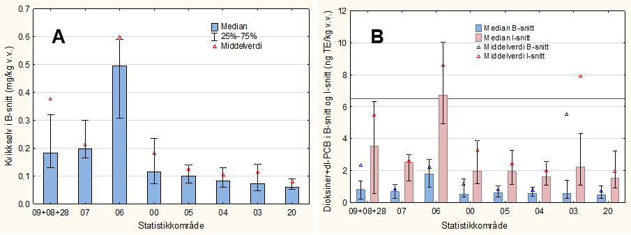 Figur 2. Konsentrasjon av (A) kvikksølv i B-snitt og (B) dioksiner og dioksinlignende PCB i B-snitt og I-snitt for atlantisk kveite fra ulike områder inndelt i henhold til Fiskeridirektoratets statistikkområder. Søylene angir medianverdier, rød eller blå trekant angir middelverdi og feilfelt viser 25 % og 75 % persentilen for hvert område. Horisontal rød linje viser EUs og Norges øvre grenseverdi for mattrygghet for dioksiner og dioksinlignende PCB (6,5 ng TE/kg våtvekt). Øvre grenseverdi for kvikksølv i kveitefilet ligger utenfor skalaen for fig 2A (1,0 mg/kg våtvekt). (Figurer fra Nilsen m.fl. 2016).