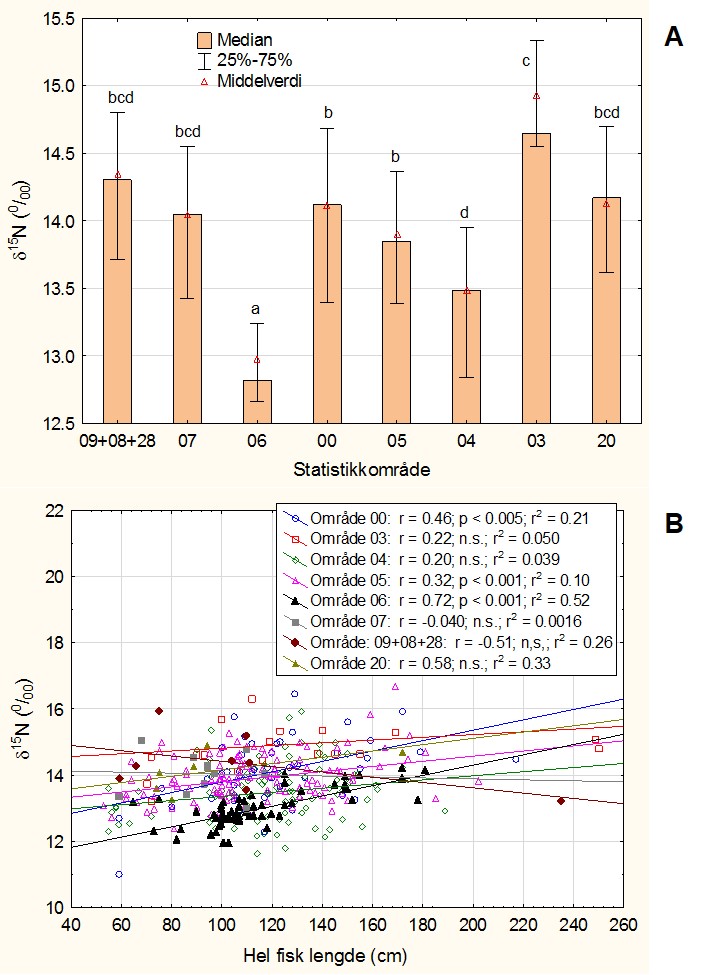 Figur 4. A) δ15N for atlantisk kveite fra ulike områder inndelt i henhold til Fiskeridirektoratets statistikkområder. Søylene angir medianverdier, rød trekant angir middelverdi og feilfelt viser 25 % og 75 % persentilen for hvert område. Ulike bokstaver over søylene viser signifikante forskjeller mellom områdene (enveis-ANOVA; p<0,05) B) Lineær regresjon av δ15N mot fiskens lengde i ulike områder. n.s.= ikke signifikant korrelasjon.