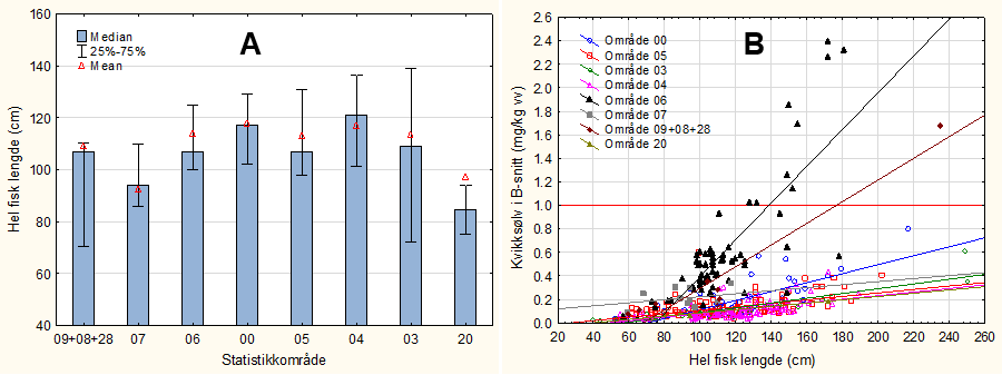 Figur 3. A) Lengde av atlantisk kveite fra ulike områder (inndelt i henhold til Fiskeridirektoratets statistikkområder. Søylene angir medianverdier, rød trekant angir middelverdi og feilfelt viser 25 % og 75 % persentilen for hvert område. B) Sammenheng mellom kvikksølvkonsentrasjon og lengde av fisken for kveite fra ulike områder. Rød, horisontal linje viser EUs og Norges grenseverdi for mattrygghet for kvikksølv i Atlantisk kveite (Figurer modifisert fra Nilsen m.fl. 2016).