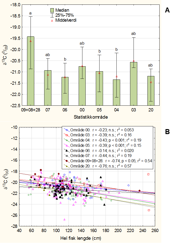 Figur 5. A) δ13C for atlantisk kveite fra ulike områder inndelt i henhold til Fiskeridirektoratets statistikkområder. Søylene angir medianverdier, rød trekant angir middelverdi og feilfelt viser 25 % og 75 % persentilen for hvert område. Ulike bokstaver over søylene viser signifikante forskjeller mellom områdene (enveis-ANOVA; p<0,05) B) Lineær regresjon av δ13C mot fiskens lengde i ulike områder. n.s.= ikke signifikant korrelasjon.