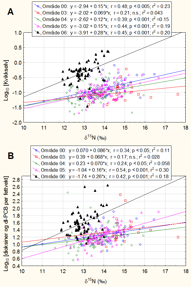 Nivåene av miljøgifter i kveitene i denne undersøkelsen var tidligere bestemt i kartleggings-undersøkelsen beskrevet over (Nilsen m.fl. 2016). For å undersøke sammenhengen mellom nivået av miljøgifter og δ15N-verdier i kveite fra de ulike områdene ble det benyttet lineær regresjon av log-transformert kvikksølvkonsentrasjon mot δ15N (Figur 7A) og lineær regresjon av log-transformert konsentrasjon av dioksiner og dioksinlignende PCB (på fettvektsbasis) mot δ15N (Figur 7B). Resultatene viste at de log-transformerte konsentrasjonene av både kvikksølv og dioksiner og dioksinlignende PCB i kveite økte lineært med økende δ15N i område 06 (r=0,45, p<0,001) og de tre nærmeste områdene nord for område 06 (område 00, 05 og 04; r=0,39-0,48, p<0,005). De fire øvrige områdene (område 09+08+28, 07, 03 og 20) viste ingen signifikant korrelasjon mellom konsentrasjonen av disse miljøgiftene og δ15N, trolig på grunn av lavt antall fisk fra hvert av områdene (n=6-24 fisk) (resultater for område 09+08+28, 07 og 20 ikke vist).
