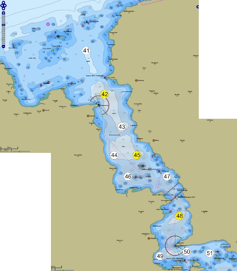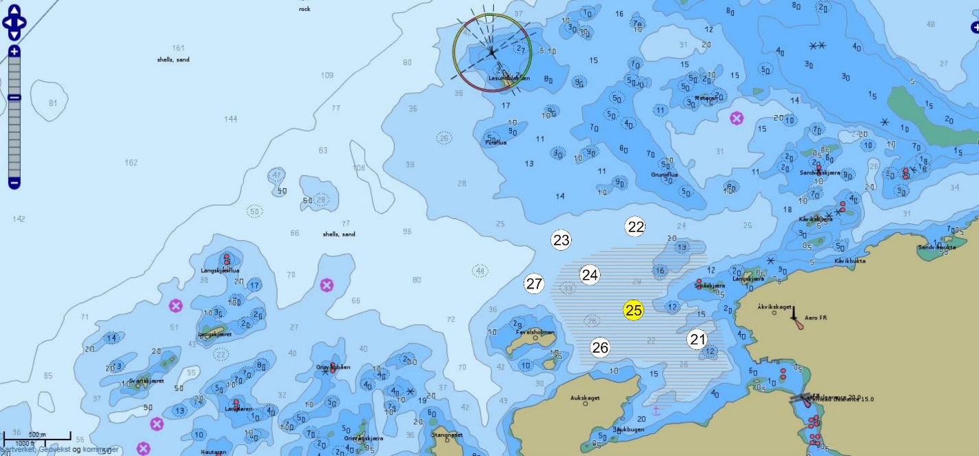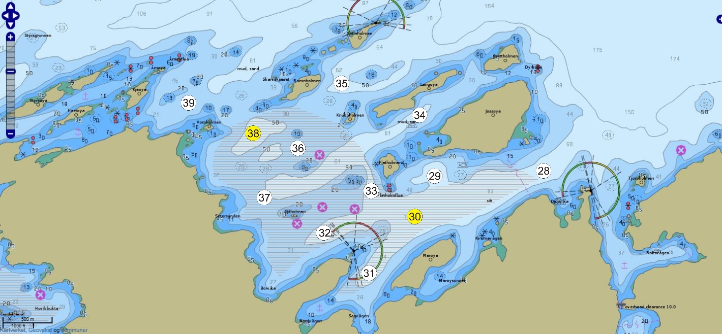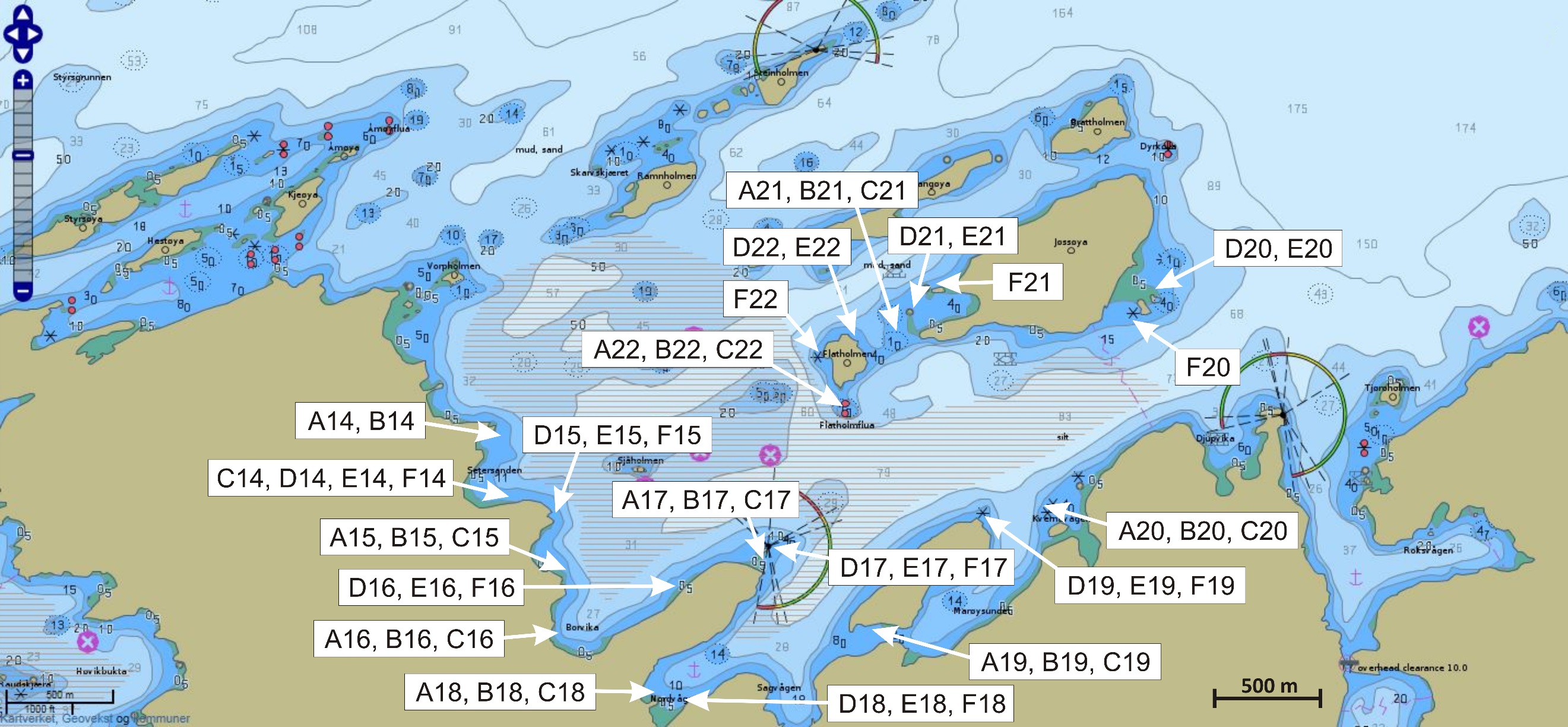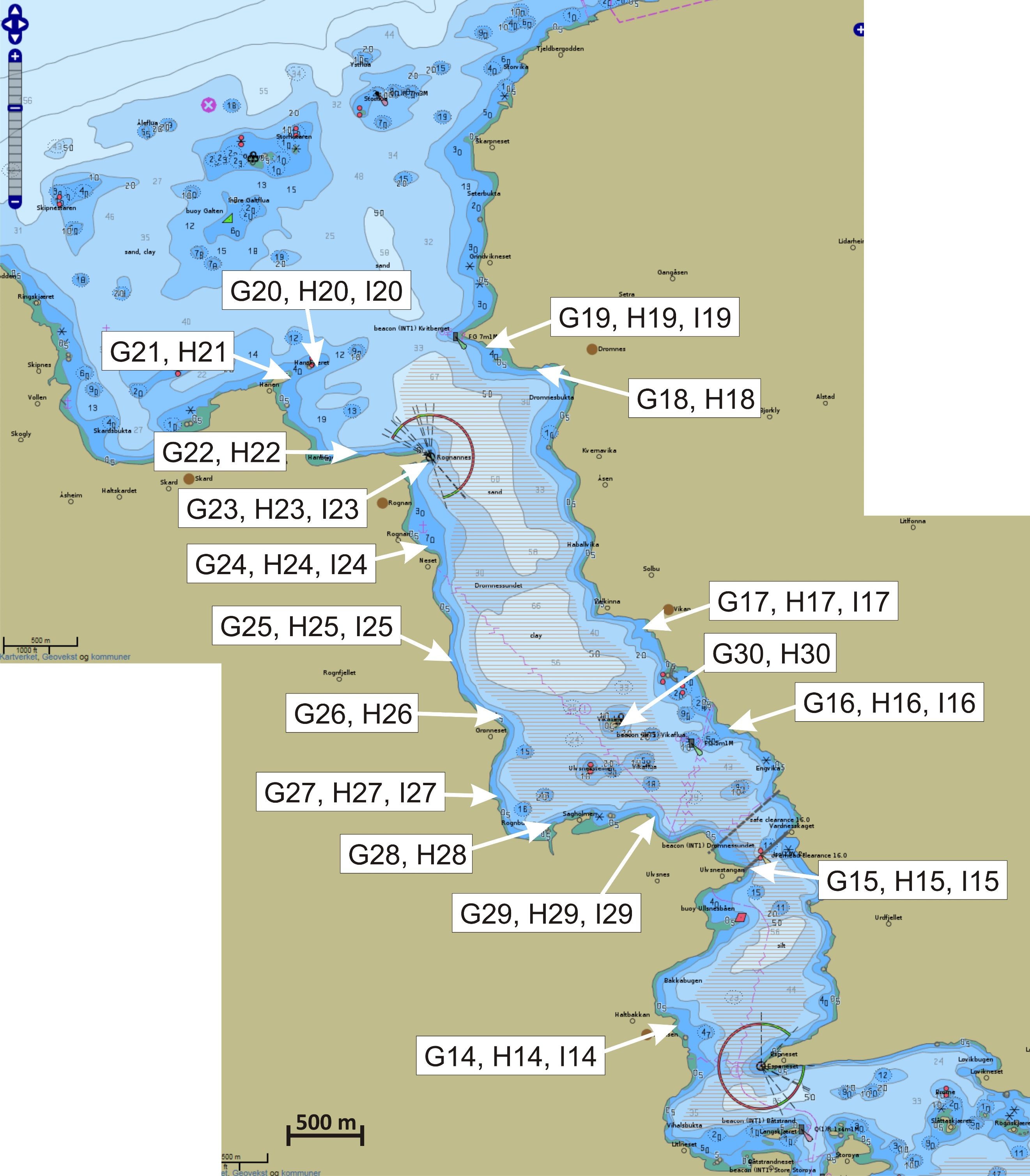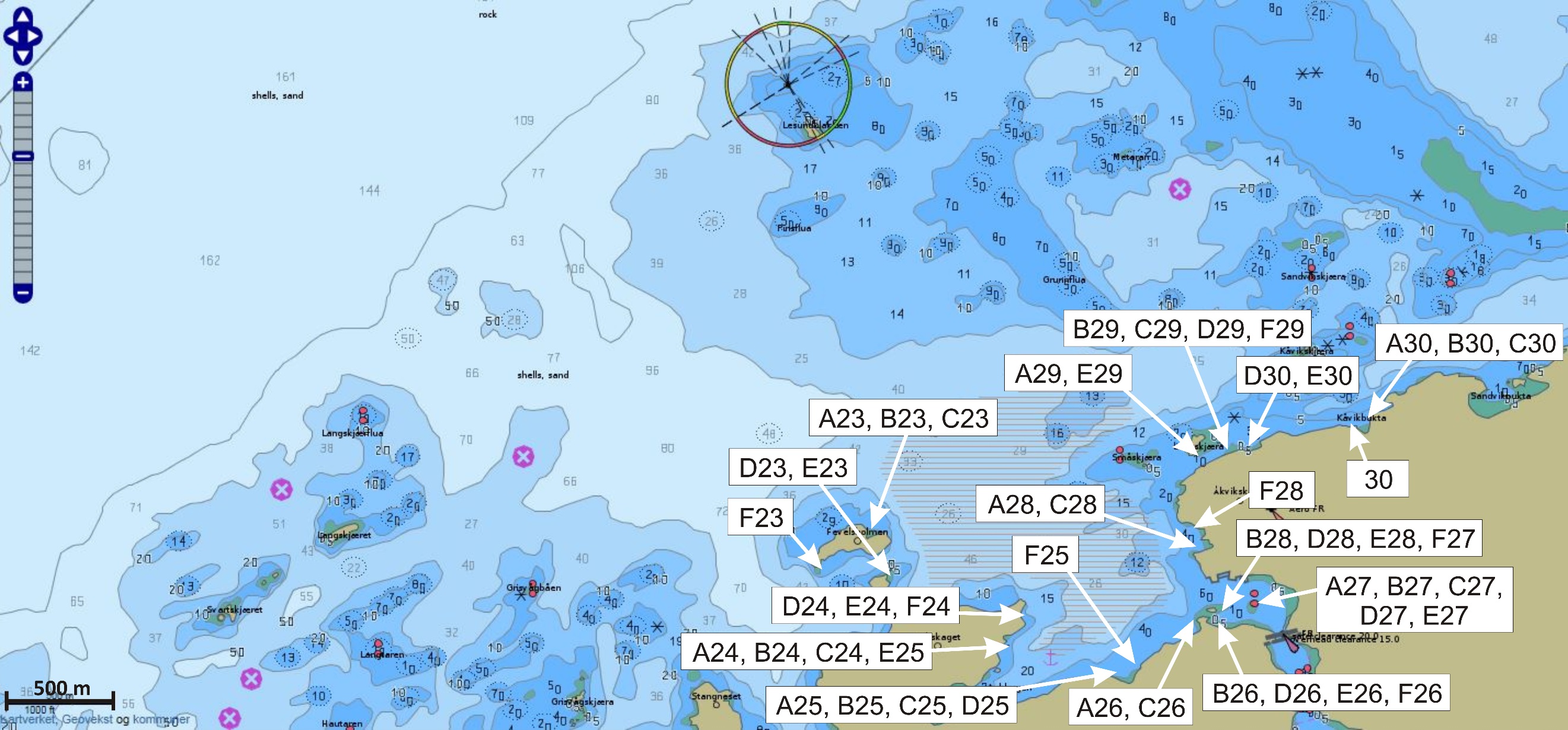 Kartet nedenfor angir kartutsnittene som er brukt i denne rapporten. Blått utsnitt er hovedområdet med Glasøysvaet og Lauvøysvaet, mens røde utsnitt er referanseområdene Dromnessundet (lengst til høyre), Åkvika (i midten) og Araneset (nederst).