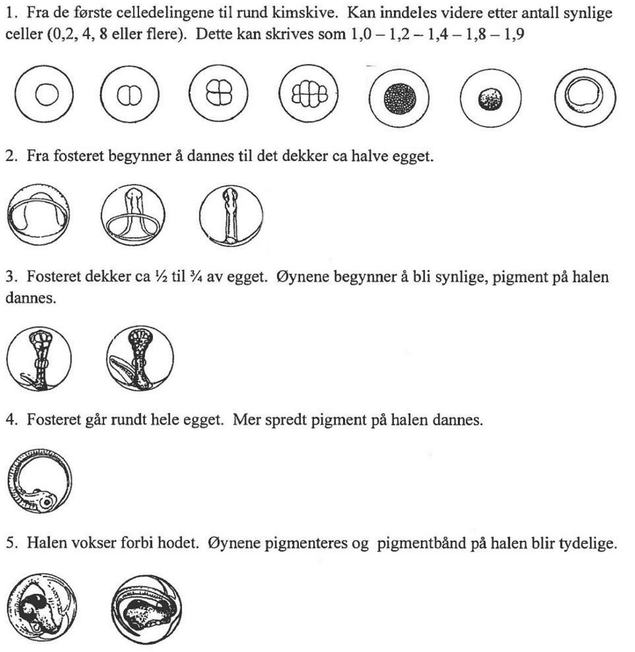 Figur 3. Bestemmelse av utviklingsstadium for torskeegg. Fra Espeland m.fl. (2013), modifisert etter Thompson & Riley (1981).