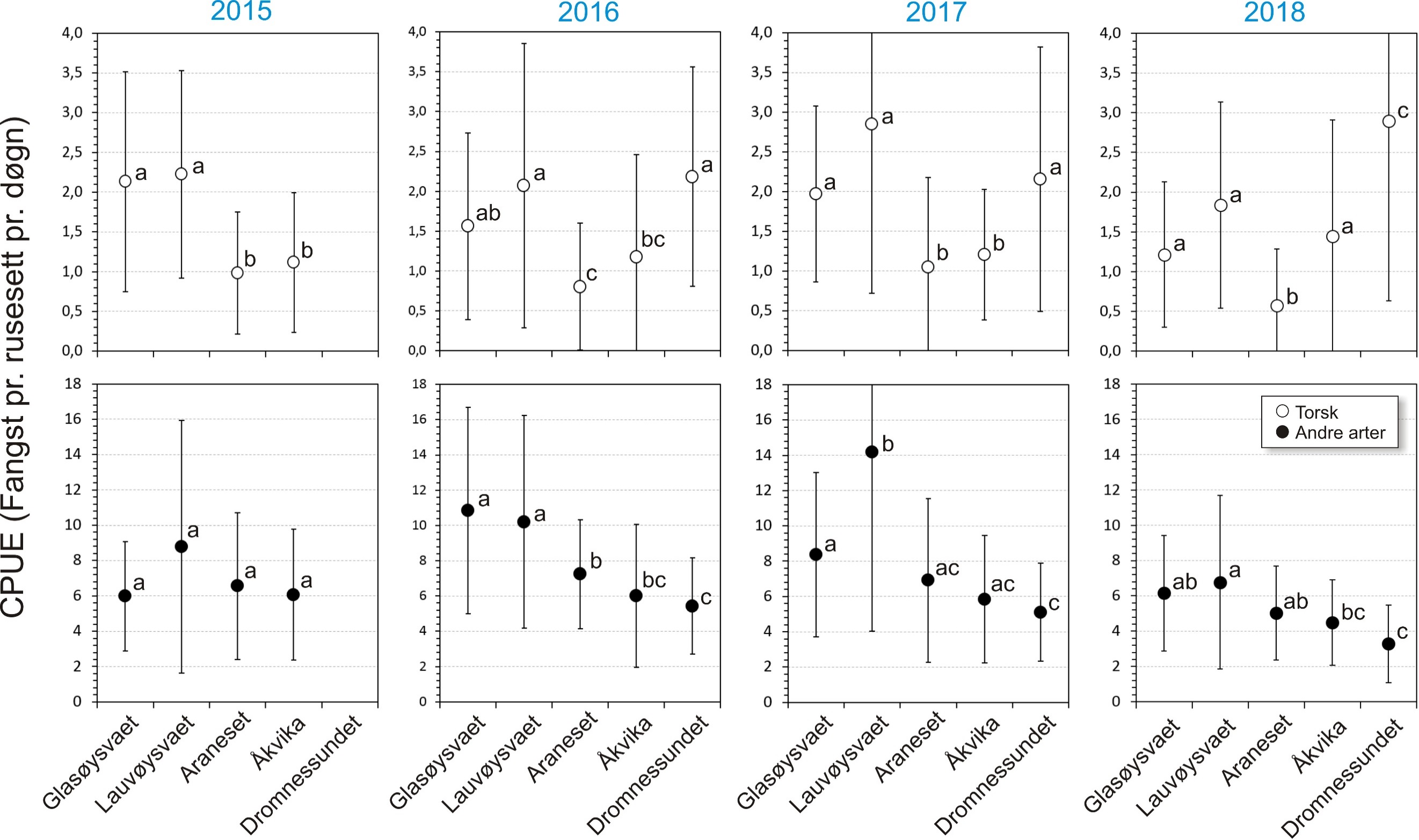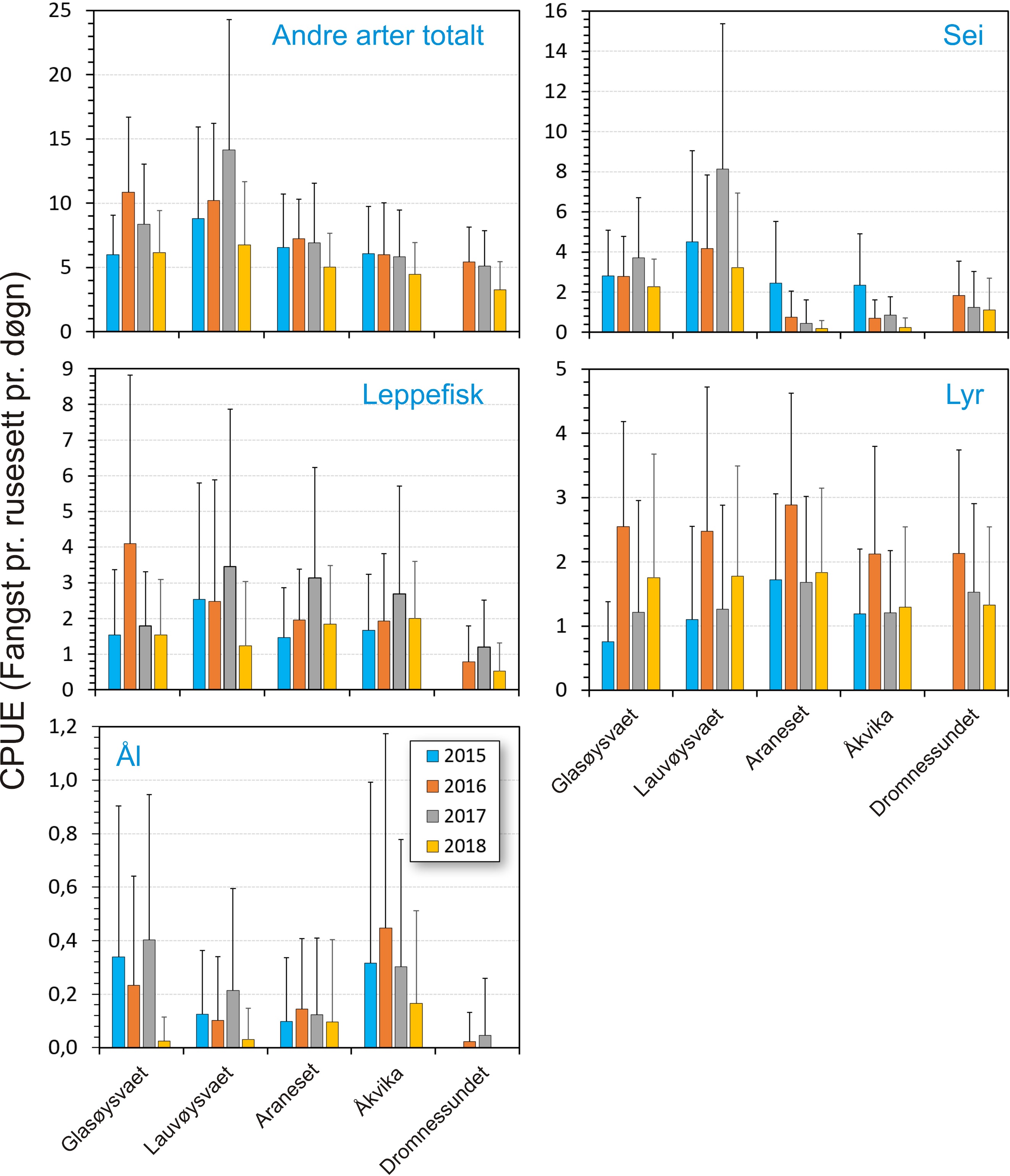 Tabell 7. Oversikt over fangst i antall av andre arter i rusene fra undersøkelsesområdene i 2018, inkludert fangst pr. enhet innsats (CPUE) gitt som antall pr. rusesett pr. døgn.