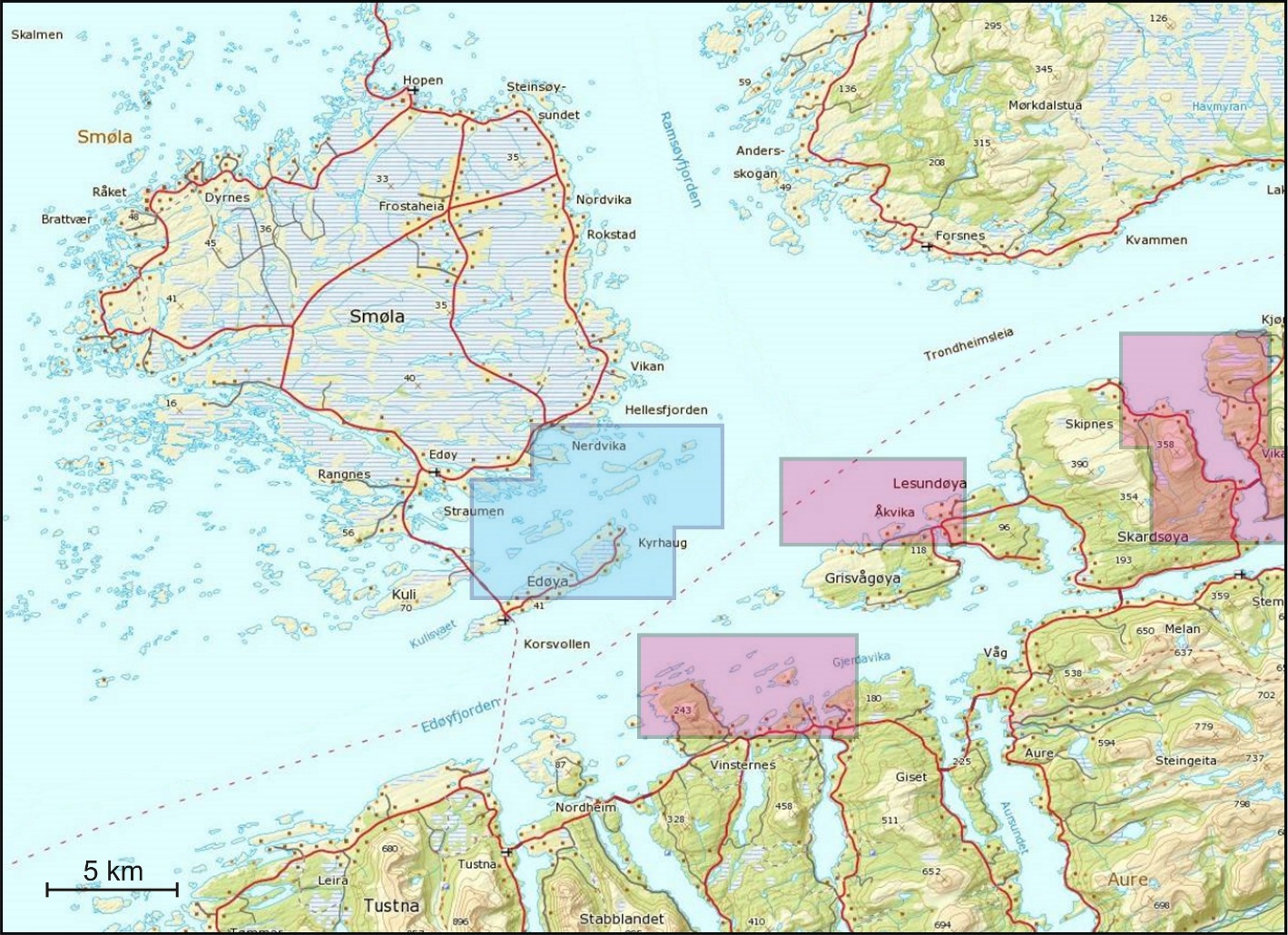 I forbindelse med etablering av en ny lokalitet for oppdrett av laks nordøst for Edøya i Smøla kommune (Nørholmen) gjennomførte Havforskningsinstituttet innledende undersøkelser av gyte- og oppvekstområder for torsk i 2015 (van der Meeren, 2016). Disse undersøkelsene ble foretatt både ved lokaliteten der oppdrettsanlegget skulle plasseres og på to referanseområder i Aure kommune som ikke har oppdrettsanlegg i umiddelbar nærhet. Studien var tenkt gjennomført med et BACI-design (Before, After, Control, Impact) der nærliggende gytefelt og oppvekstområder overvåkes både før og etter etablering av oppdrettsanlegget. Imidlertid ble det satt fisk i anlegget på Nørholmen allerede i mai 2016, og ytterligere ett referanseområde uten nærhet til oppdrettsanlegg (Dromnessundet) ble derfor inkludert i studien da datagrunnlaget før oppstart ble noe redusert.