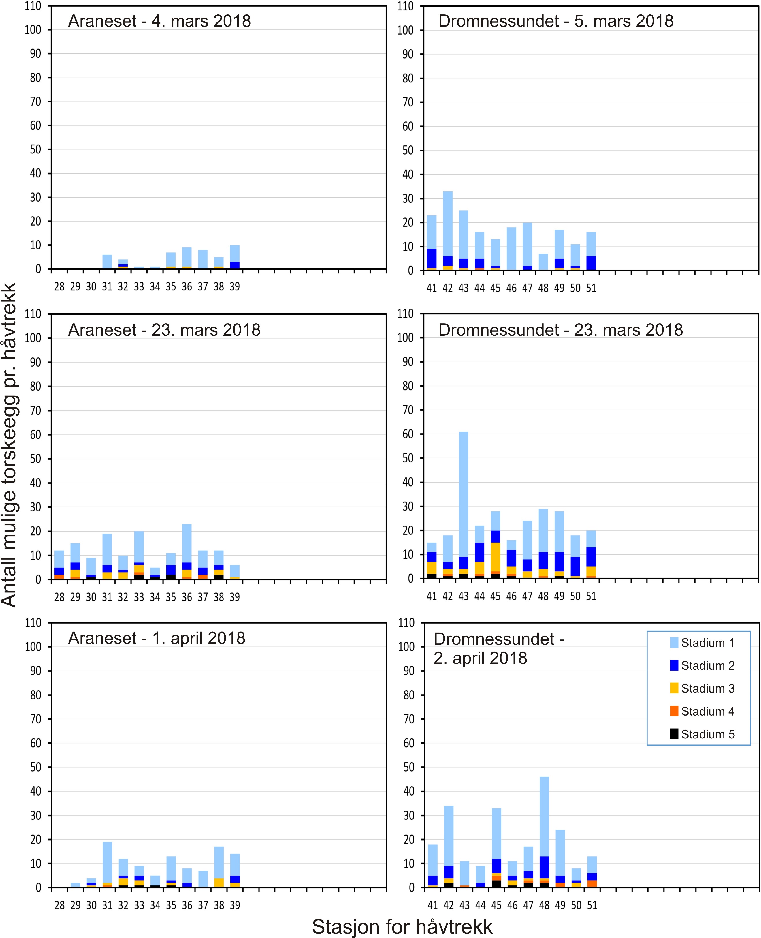 fotograferingen. Bilder av en eggprøve ble tatt både i lysfelt (Oblique) og mørkefelt (DF) under 0,8 (8X) forstørrelse. Et eksempel på slike eggbilder er gitt i figur 2. Eggstørrelse og utviklingsstadier ble senere bestemt fra fotografiene ved hjelp av Motic Images Plus 2.0 programvare. Stadier ble bestemt etter Thompson & Riley (1981), med modifikasjon av at stadium 1 ble delt inn i flere understadier som tilsvarte celleantall (1,0 – 1,2 – 1,4 – 1,8 og 1,9 for 1, 2, 4, 8 og flere celler, se figur 3). Stadier tidligere enn 1,9 ble sjelden observert, noe som kan forklares ut fra tidsrommet mellom da prøven ble tatt og til den ble fotografert. Stadiebestemmelsen gir derfor et litt forsinket bilde av faktisk eggutvikling på prøvetakingstidspunktet, særlig for egg like etter gyting som utvikler seg hurtig. Stadium 1 representerer derfor nærhet til gyteområdet, da disse eggene er relativt nylig gytt. En del egg var døde ved opparbeiding og kunne derfor ikke sikkert bestemmes til stadium. Mest sannsynlig var disse i stadium 1,9. Eggstørrelser på 1,2-1,6 mm diameter angir mulige torskeegg, og i resultater og diskusjon er det egg i dette størrelsesintervallet som presenteres i figurene. Alle egg ble fiksert på absolutt alkohol for senere DNA-analyser for å bestemme art og eventuell stamme (for eksempel kysttorsk eller skrei). I tillegg til håvtrekk ble det innhentet hydrografiske data (saltholdighet, temperatur og oksygen) fra overflaten til bunn ved hjelp av en SAIV (SD 204) CTD-sonde med en Rinko III Oksygen-optode (modell ARO CAV-SA).