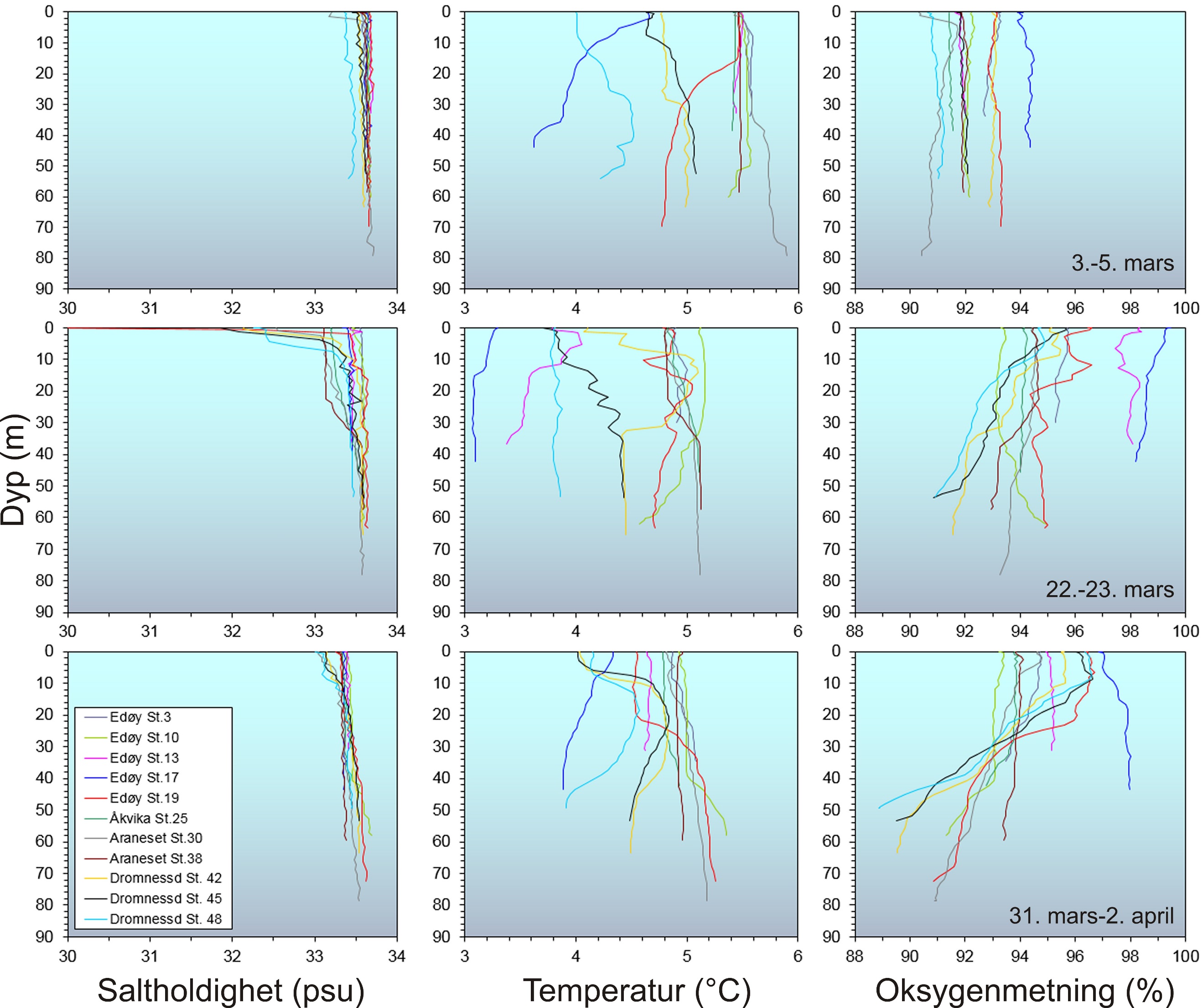 Tabell 1. Oversikt over egg- og hydrografistasjoner, posisjoner, dyp og antall egg samlet inn fra undersøkelsesområdene. Eggantall angir snitt per håvtrekk (± standardavvik) av alle tre toktene.