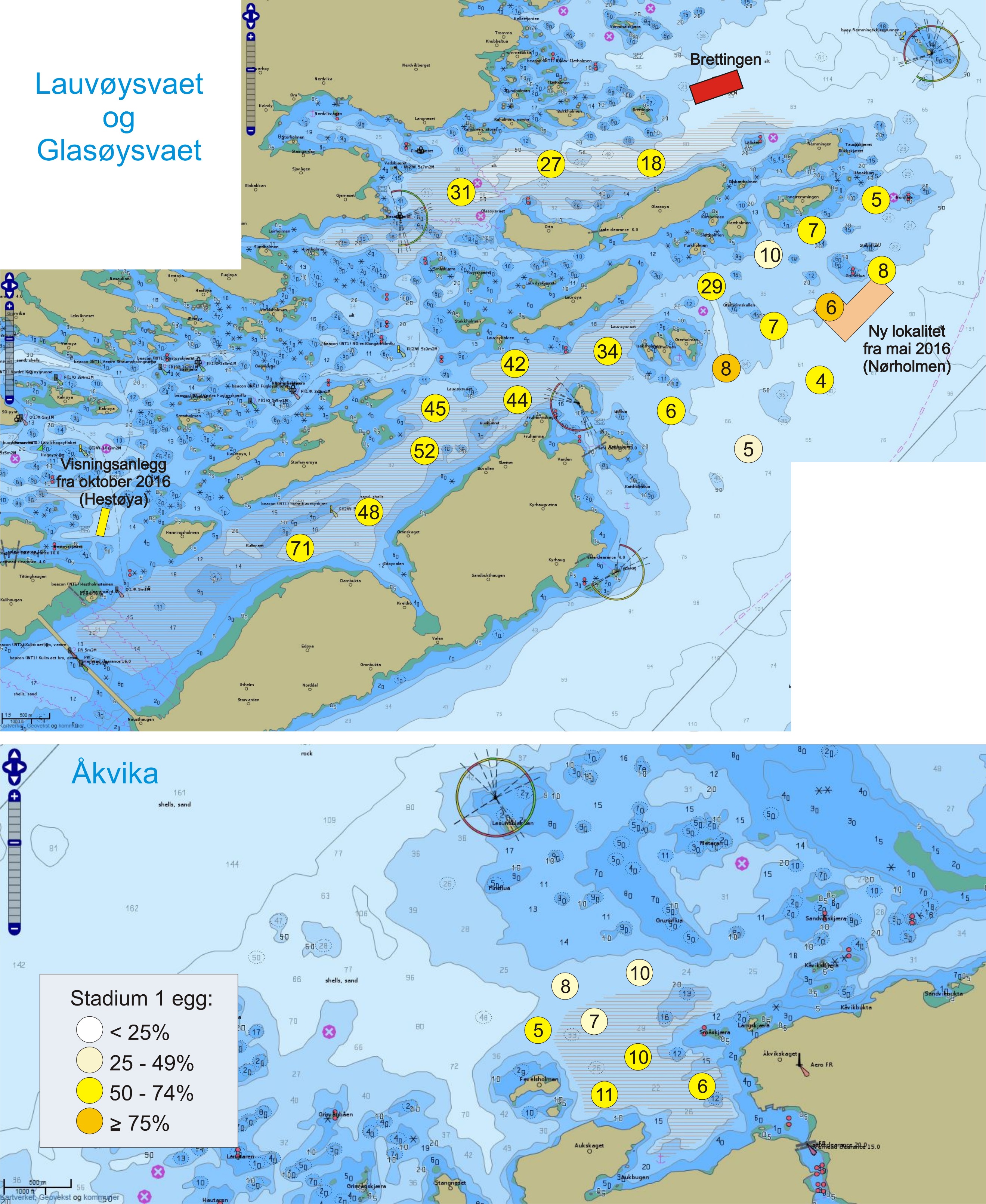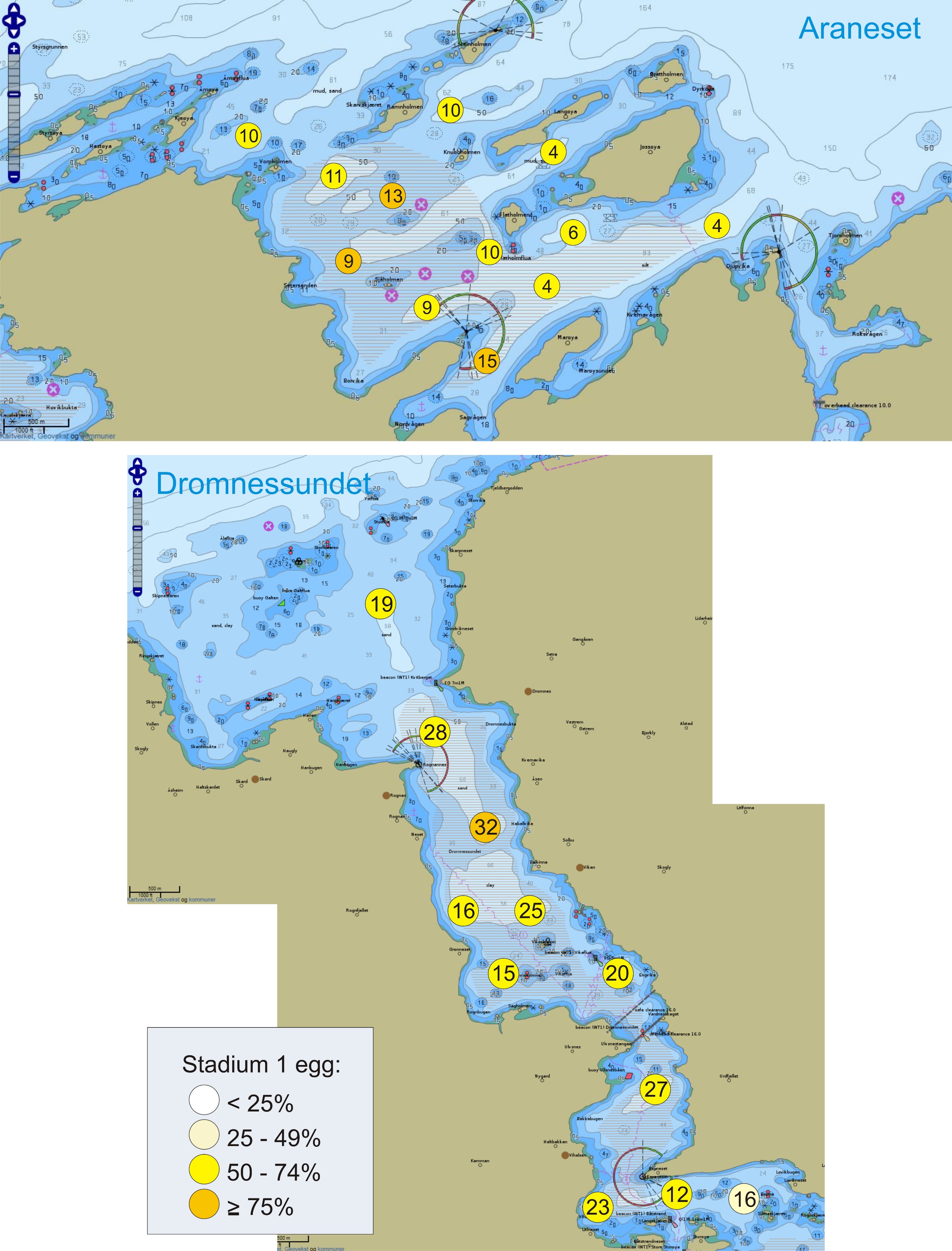 Figur 5. Referanseområdene Åkvika (øverst) og Araneset (nederst). Kartet viser Fiskeridirektoratets angivelse av gyteområder per 1. mars 2016 (brun skravering) og stasjonsnett for håvtrekk med hensyn til dette (sirkler med stasjonsnummer). Gule sirkler angir hydrografiprøve i tillegg til håvtrekk.