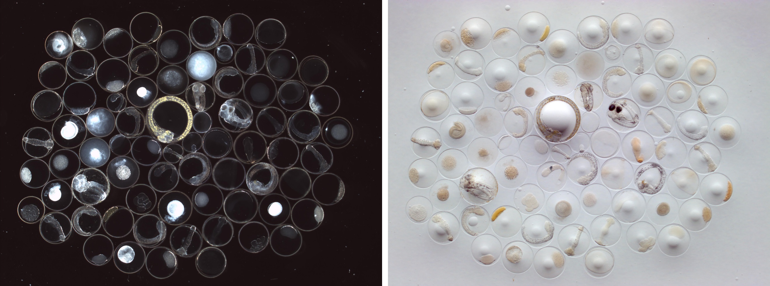Figur 2. Egg fra stasjon 17 på Lauvøysvaet 31. mars 2018 (mørkefelt til venstre og lysfelt til høyre).