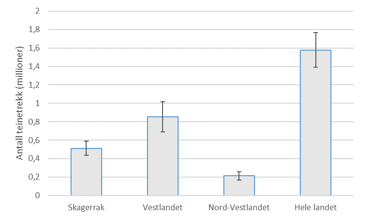 Figur 6. Totalt antall teinetrekk i yrkesfisket regionalt og for hele landet (millioner) i 2018. 95 % konfidensintervall.