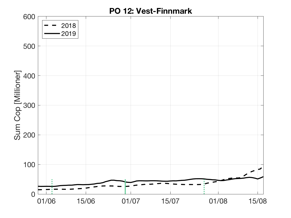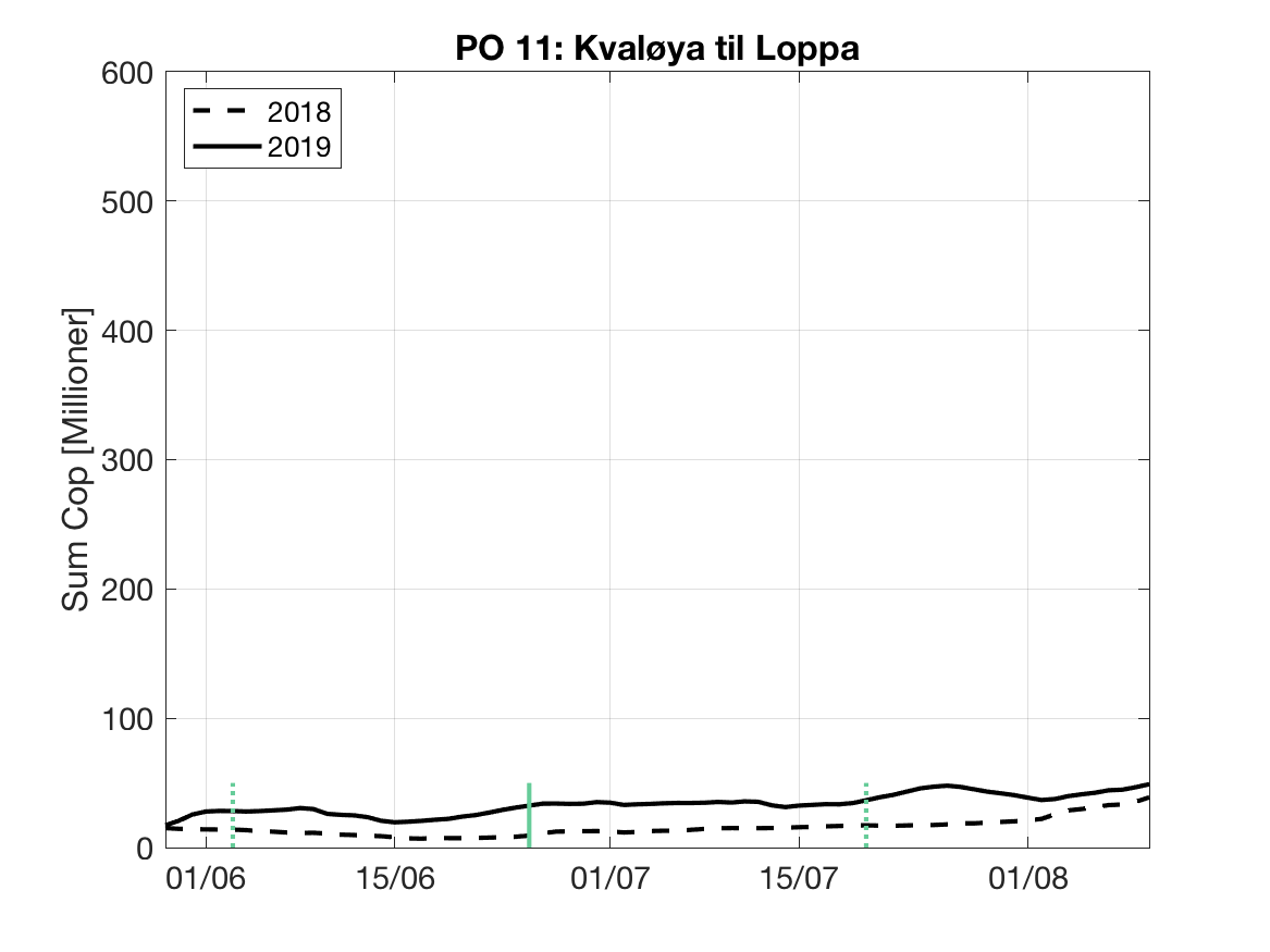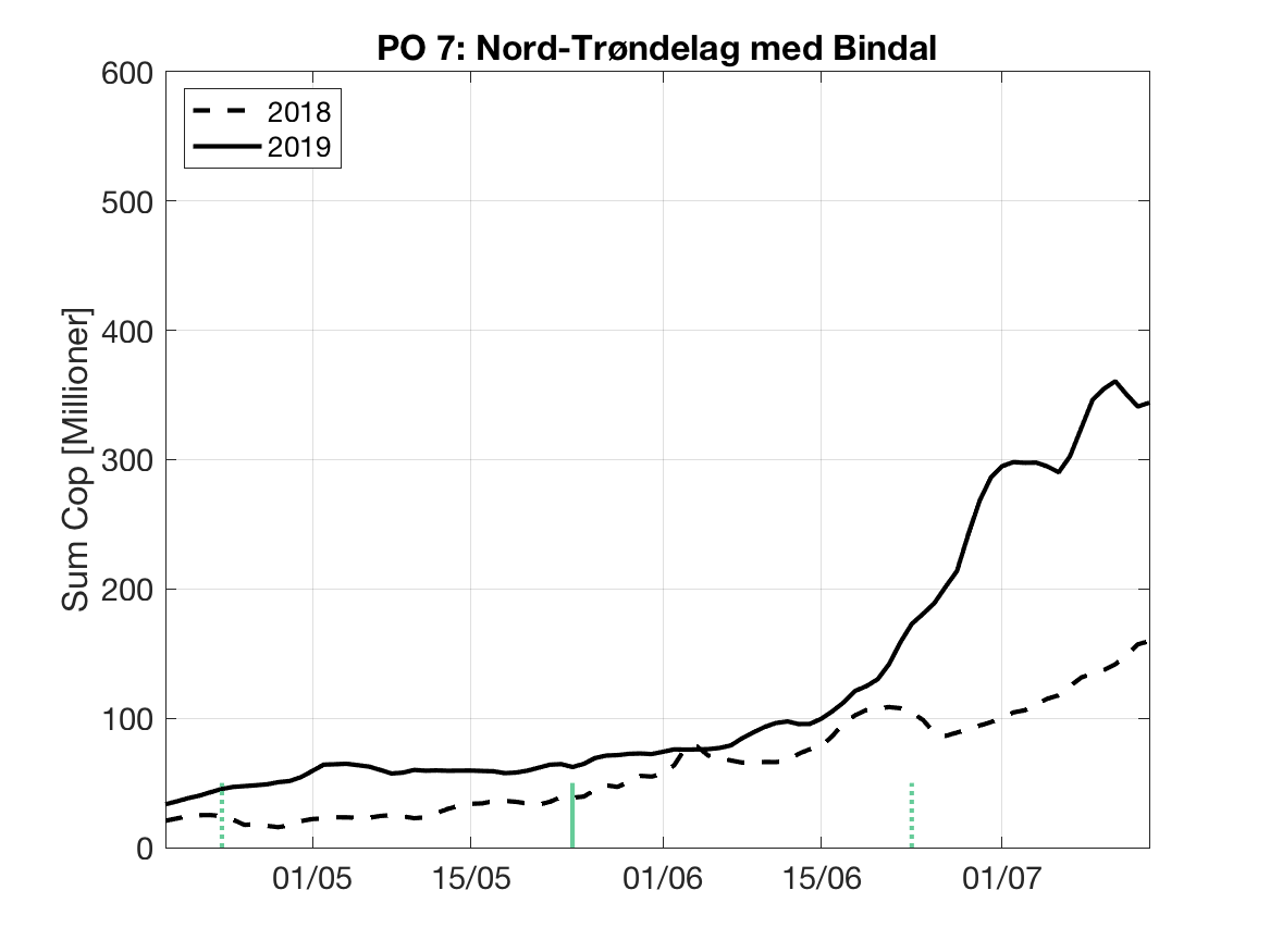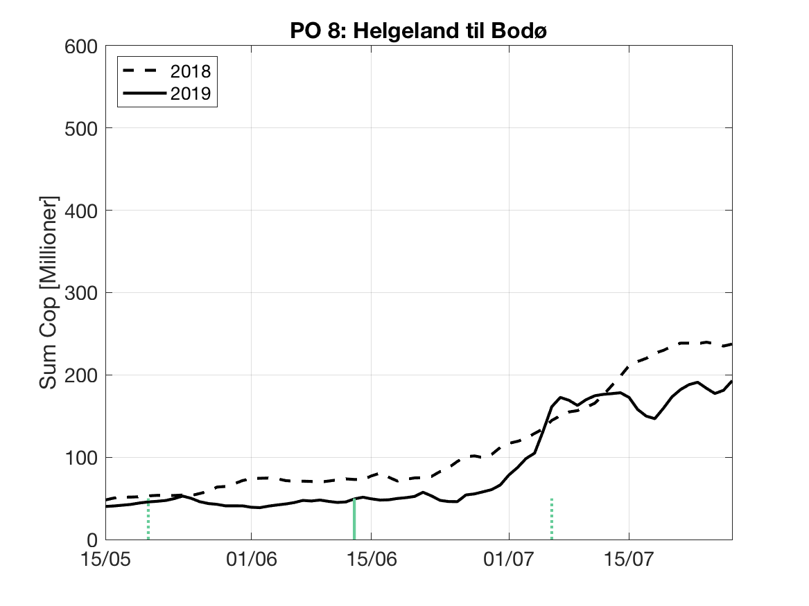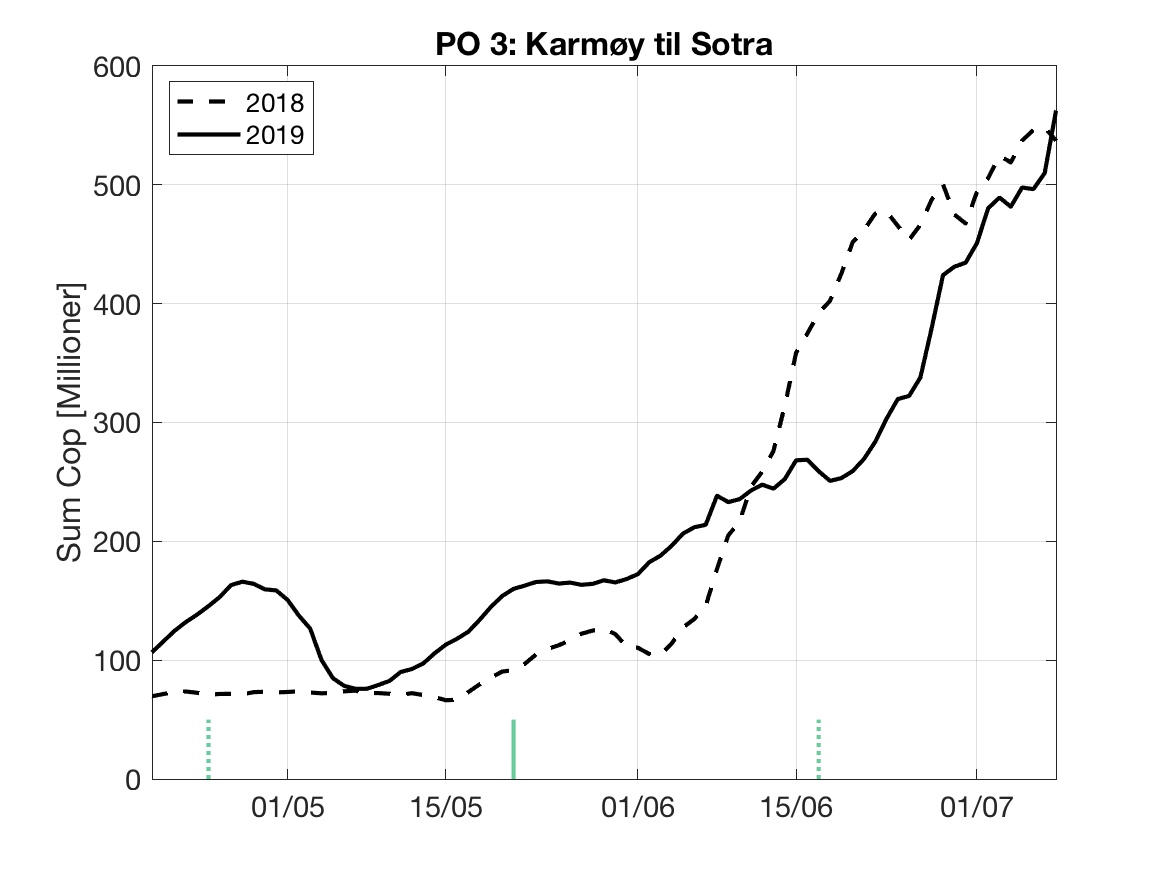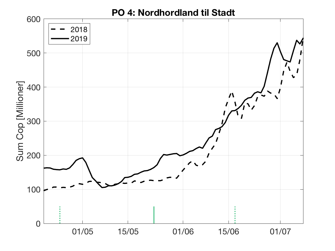 Under følger en kort vurdering av bakgrunnsdataene for Havforskningsinstituttet sine modellprodukt til Trafikklysvurderingen 2019. Formålet er å vise når resultatene vil være mest følsomme for variasjoner i utvandringstidspunkt og forløp, samt gi et best mulig bilde av den horisontale variasjonen i tetthet av smittsomme lakseluslarver innen de ulike produksjonsområdene.
