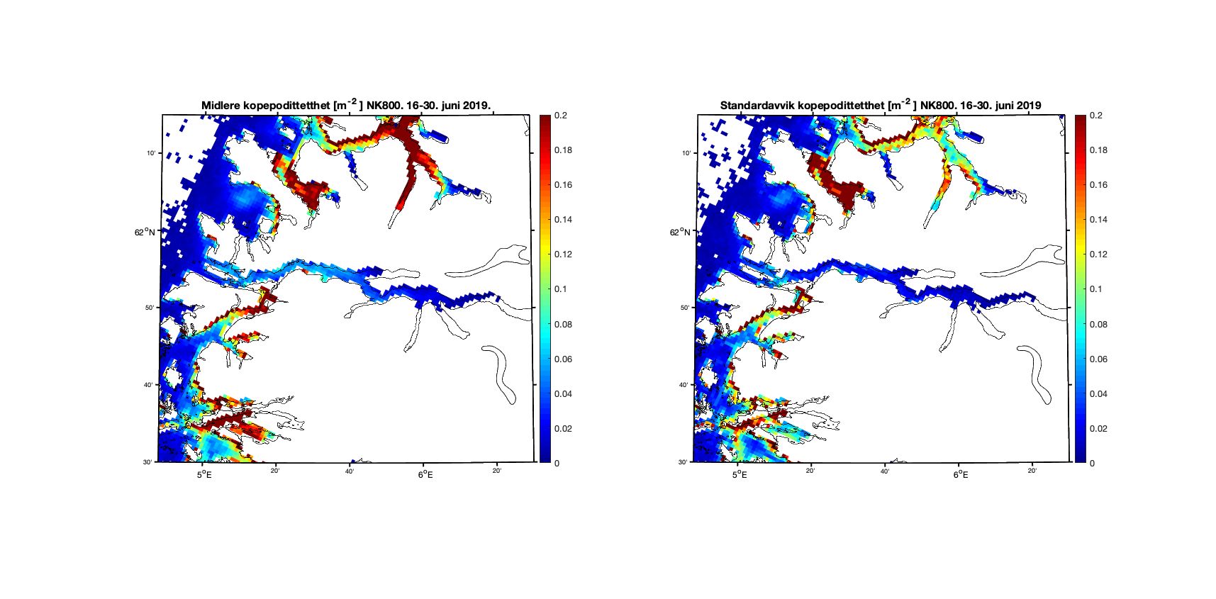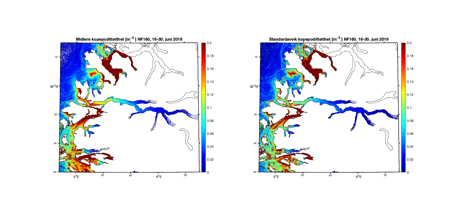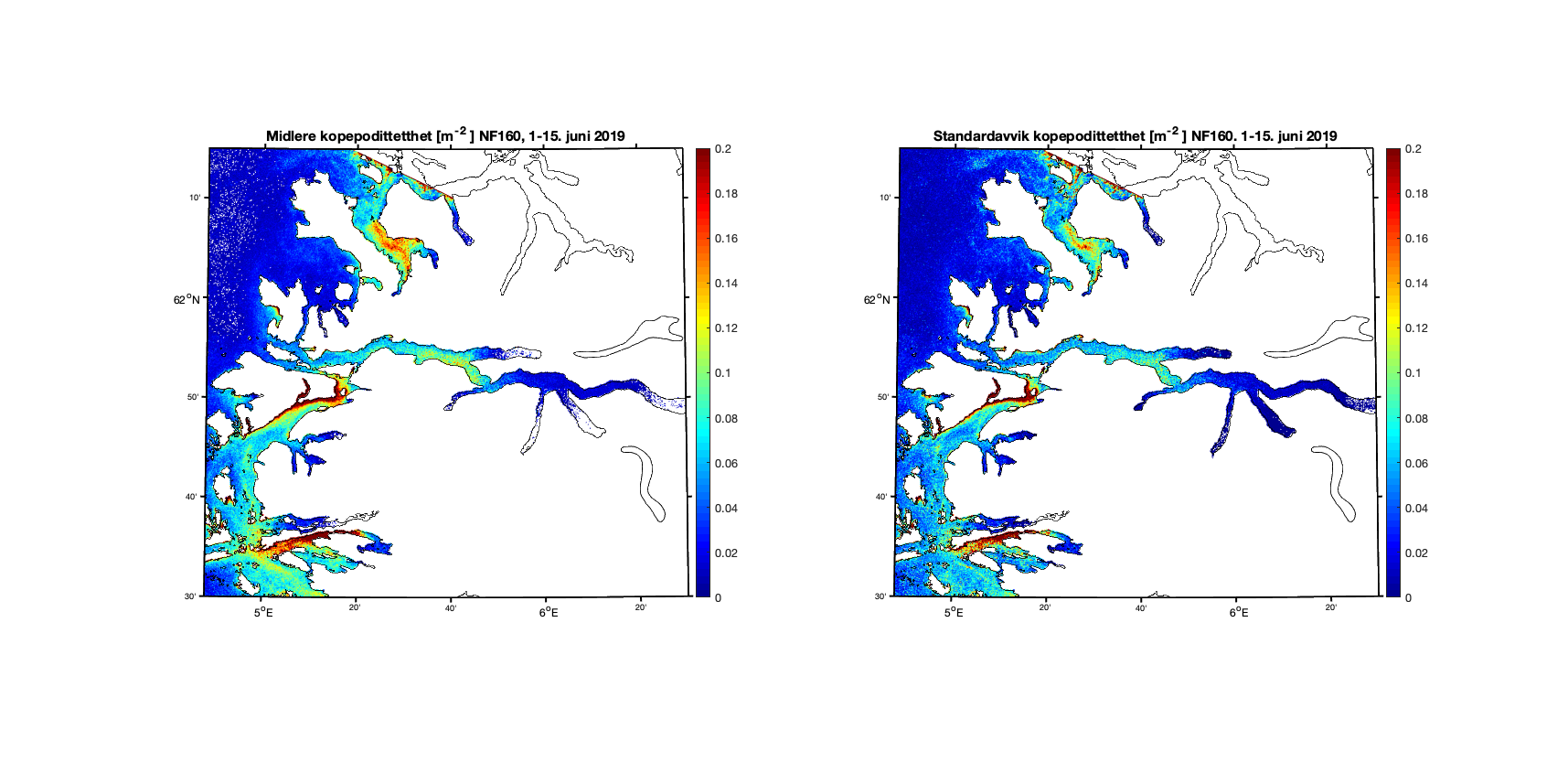 Aggregerer vi resultatene i toukersperioder finner vi for 1-15. juni 2019 at kopepodittfordelingen for begge de to strømmodellene er relativt like men med noen forskjeller på detaljnivå (Figur 8 og 9). Standardavviket (høyre kolonne i figurene) viser at det er mer variabilitet i resultatene med høyere oppløsning, omtrent som forventet.