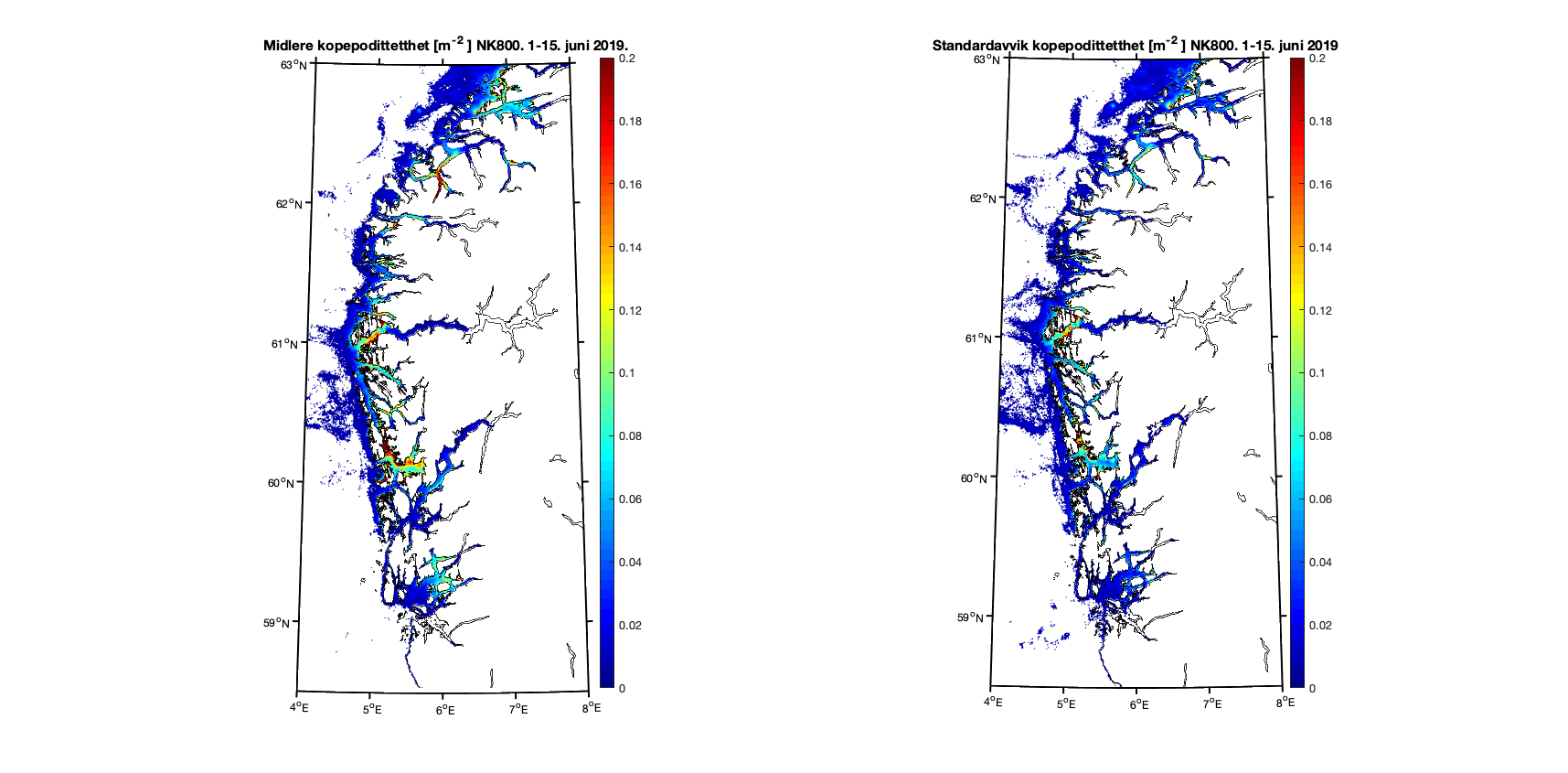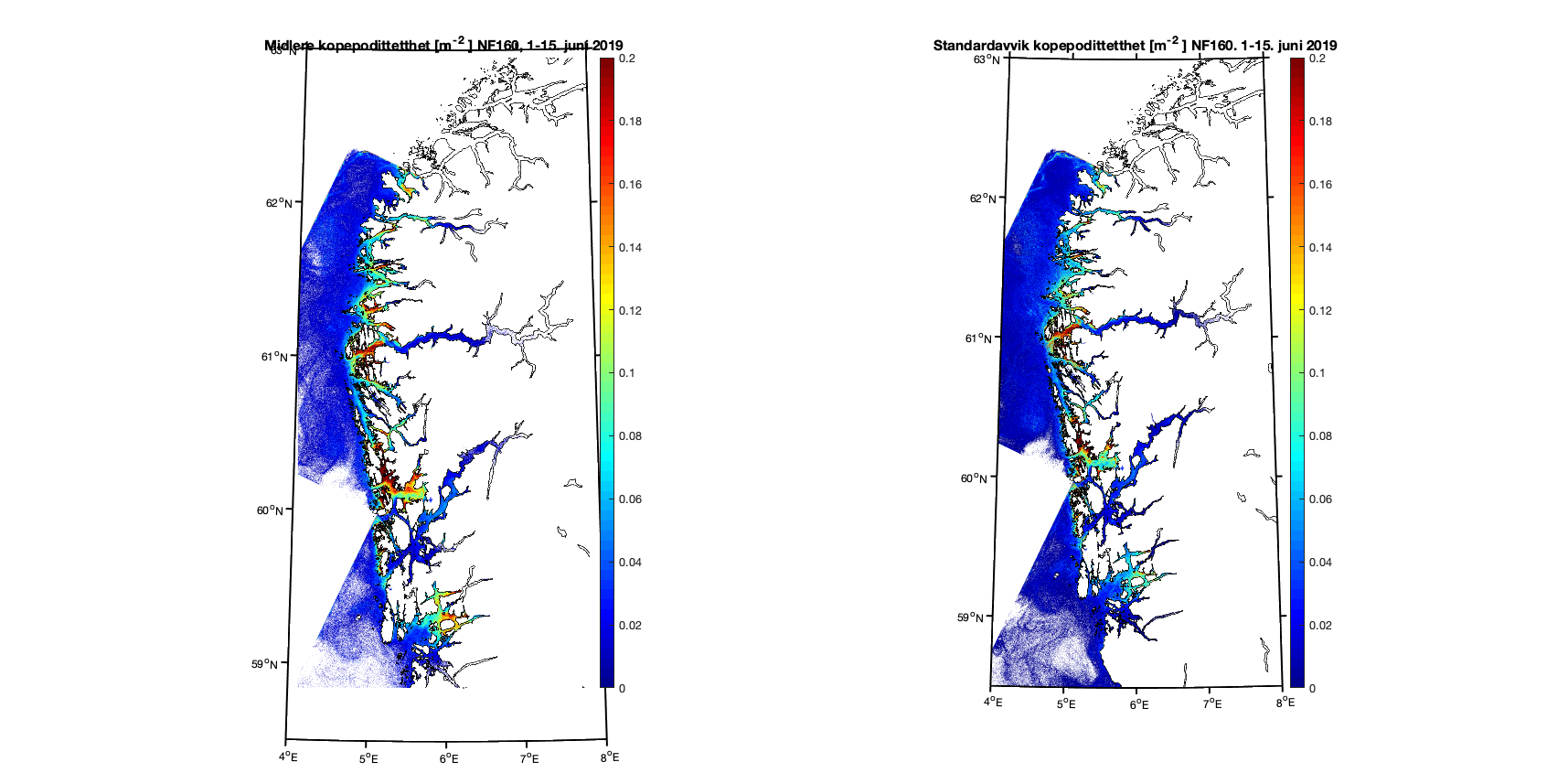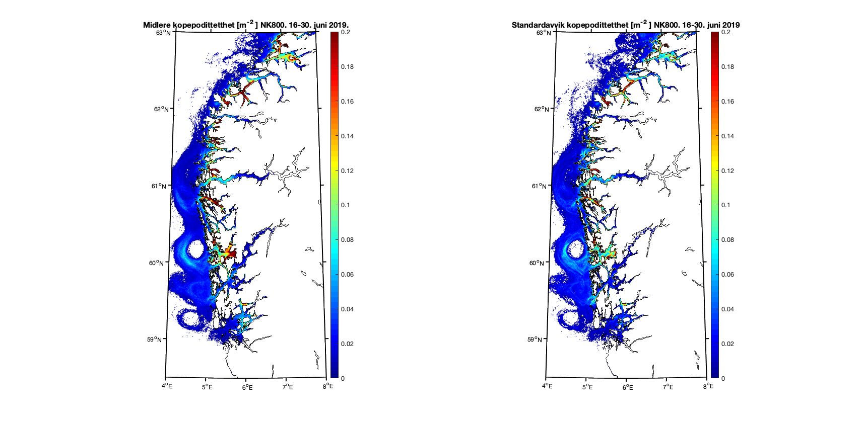 Aggregerer vi resultatene i toukersperioder finner vi for 1-15. juni 2019 at kopepodittfordelingen for begge de to strømmodellene er relativt like men med noen forskjeller på detaljnivå (Figur 8 og 9). Standardavviket (høyre kolonne i figurene) viser at det er mer variabilitet i resultatene med høyere oppløsning, omtrent som forventet.