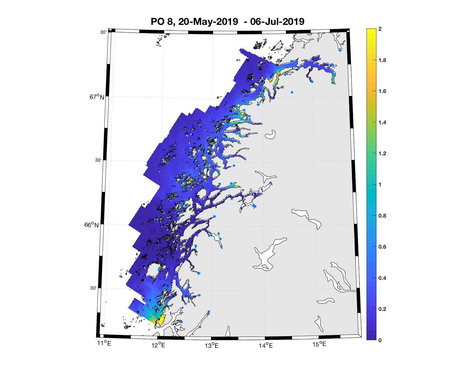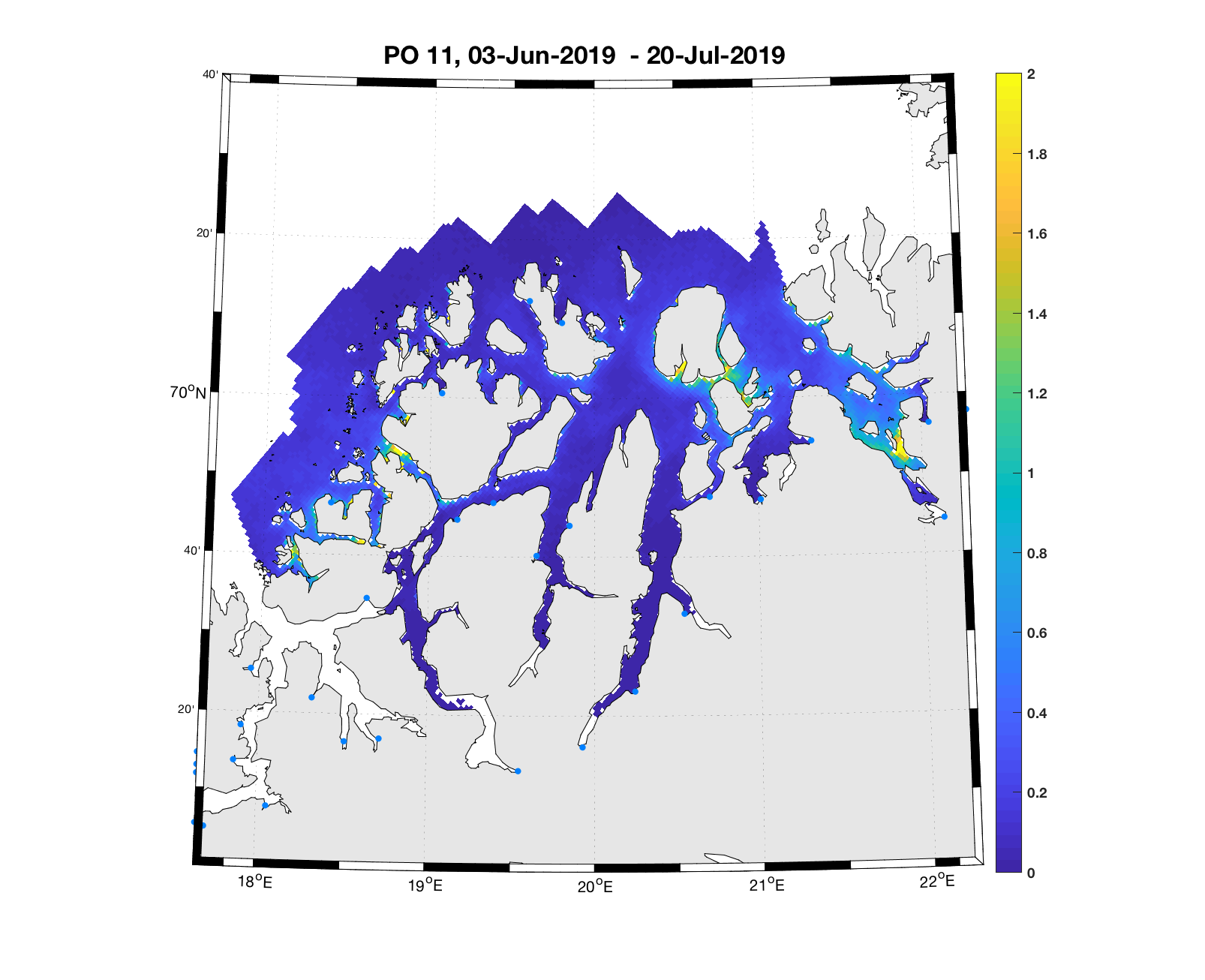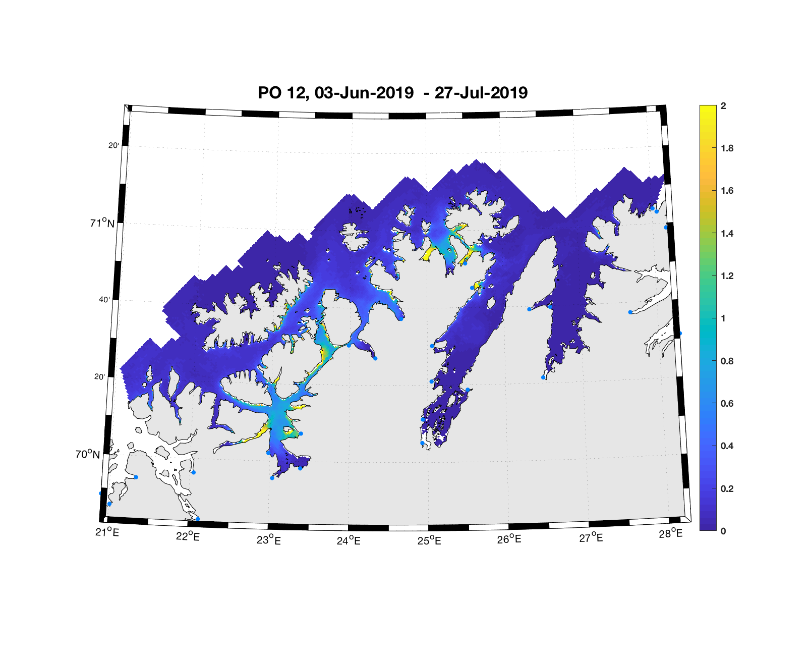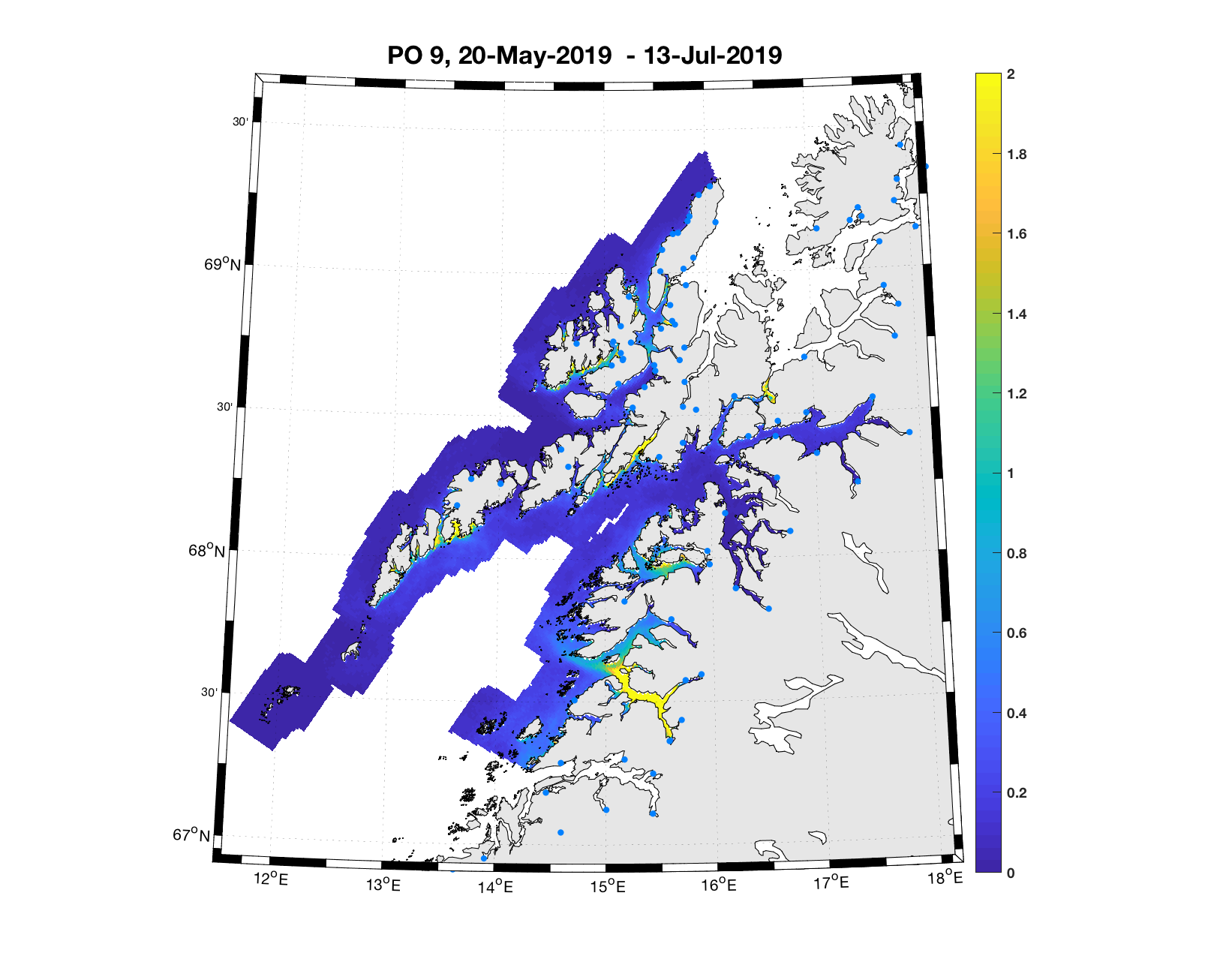 PO13: Tidsutvikling: Tetthetskart: Summert over den lange utvandringsperioden er der lave konsentrasjoner av lakseluslarver i hele området.