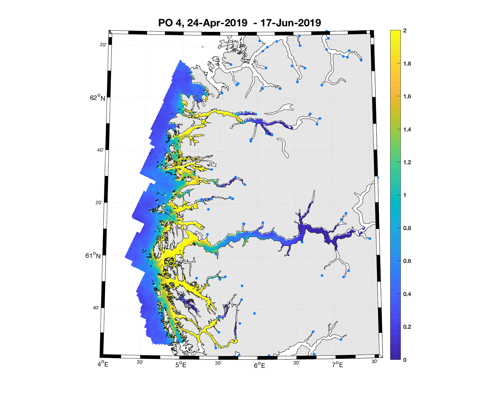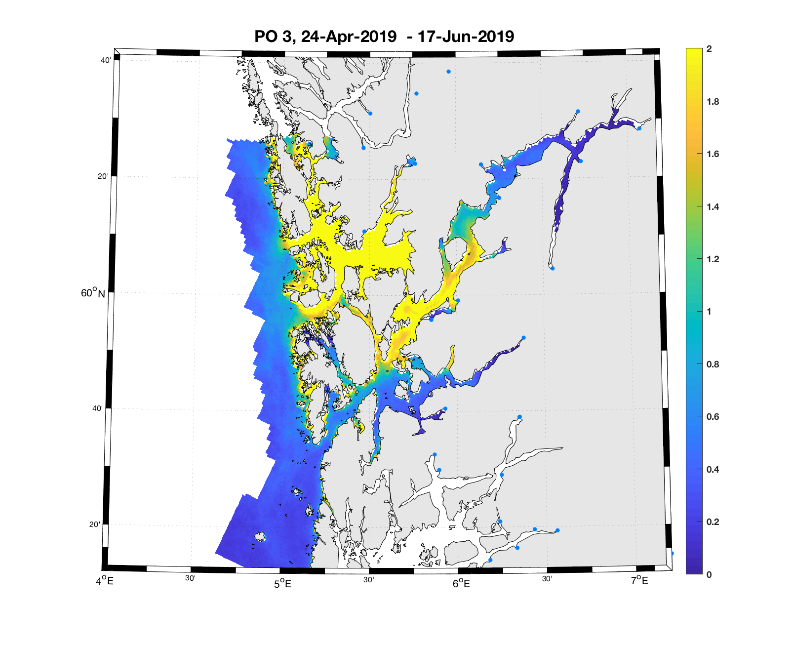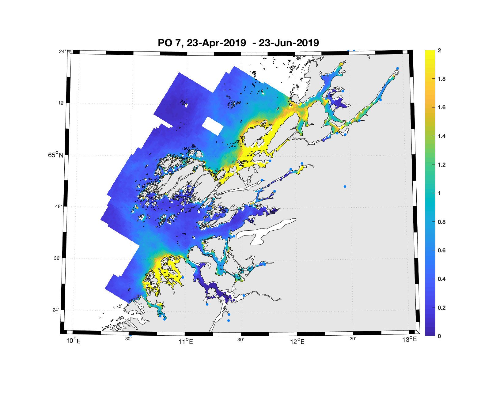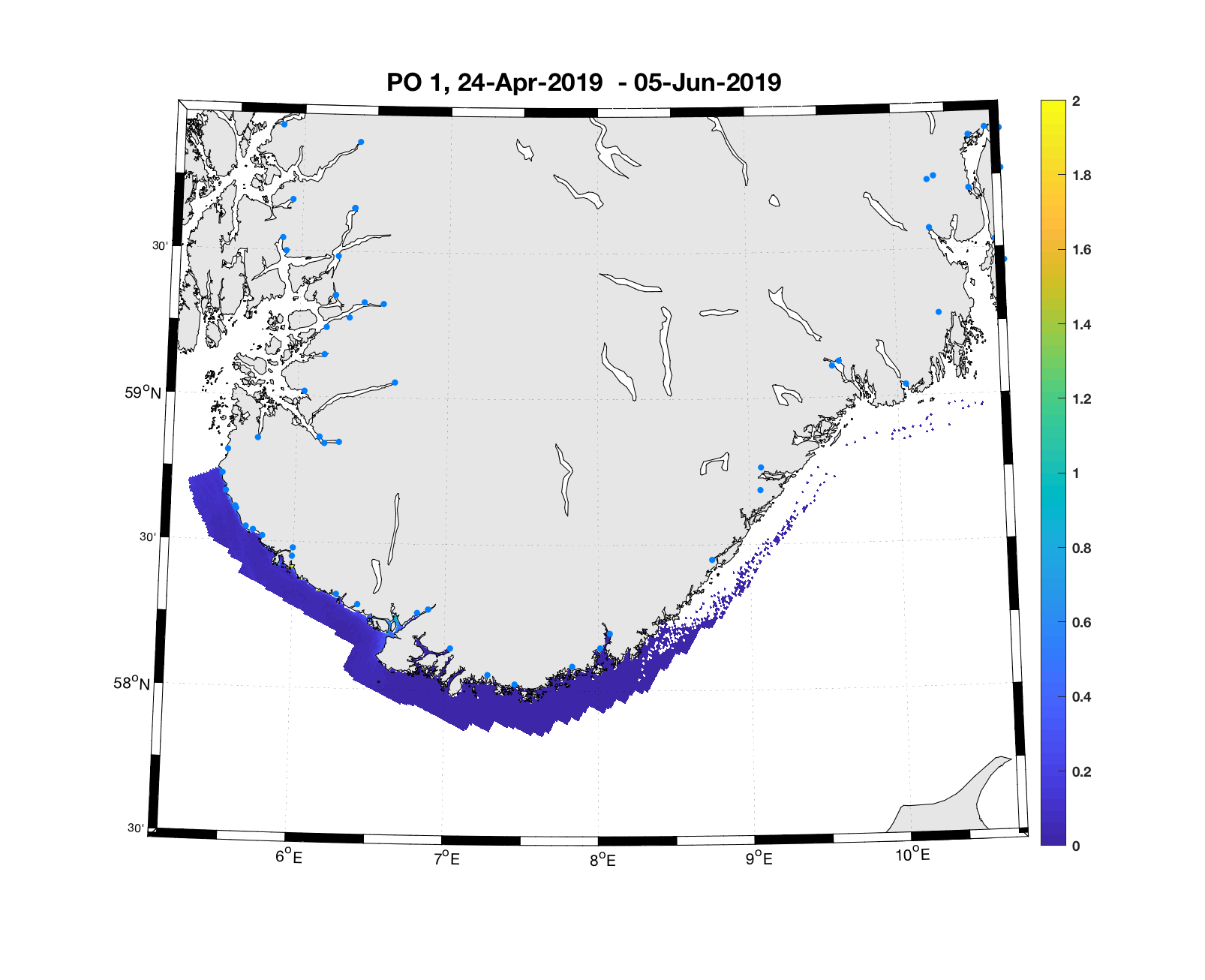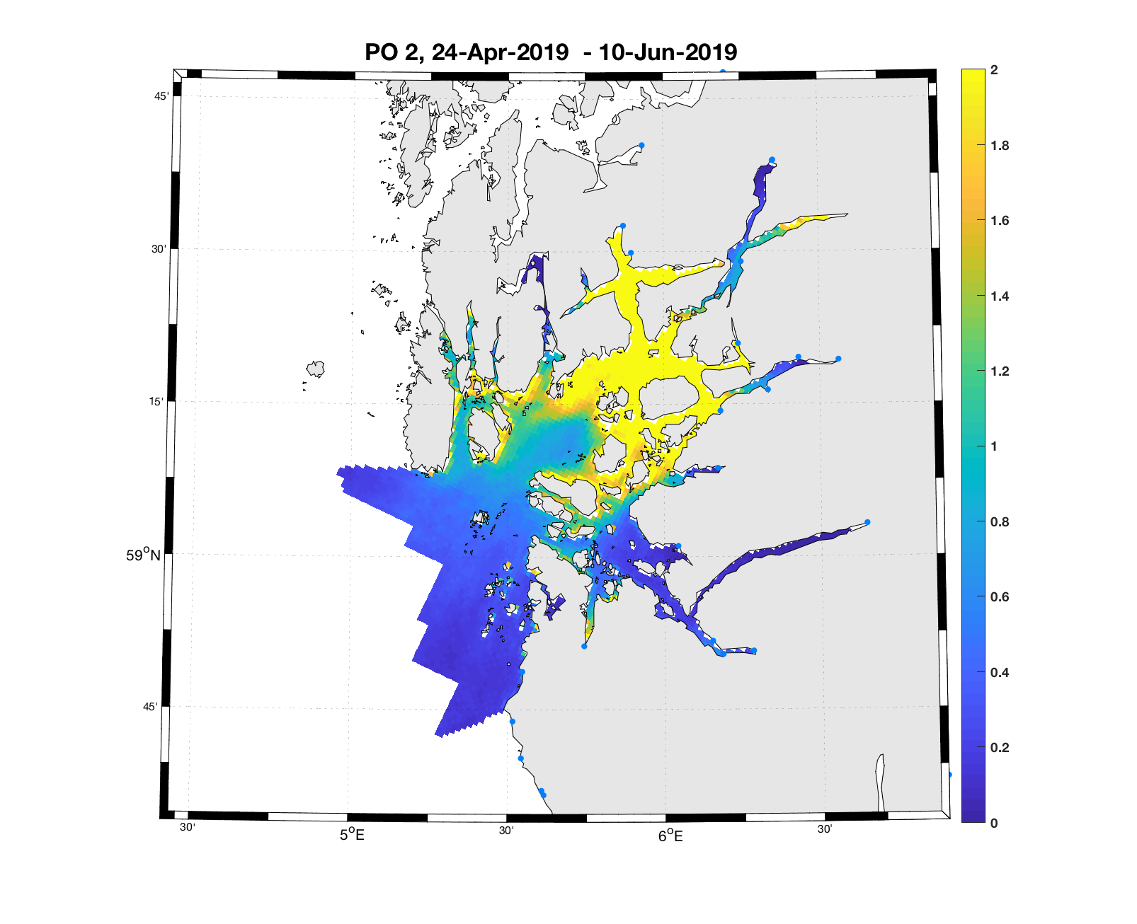 PO13: Tidsutvikling: Tetthetskart: Summert over den lange utvandringsperioden er der lave konsentrasjoner av lakseluslarver i hele området.