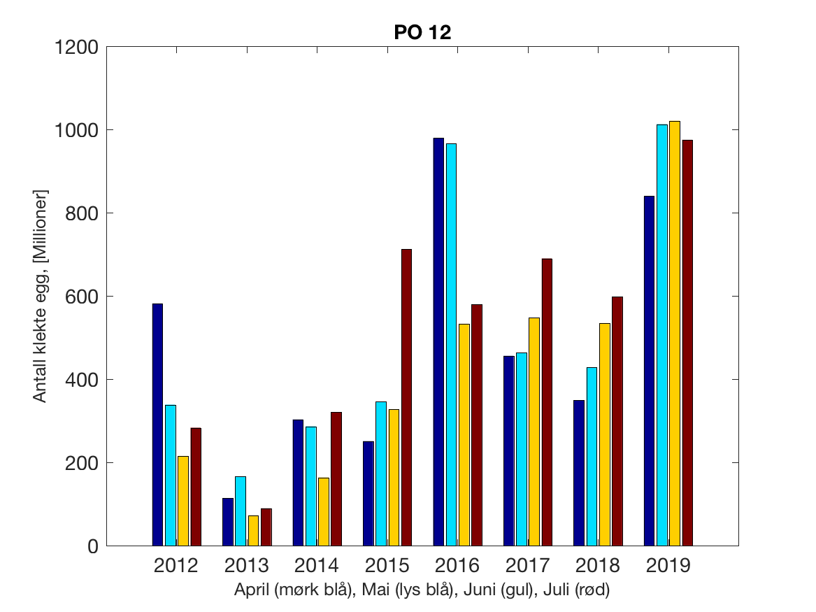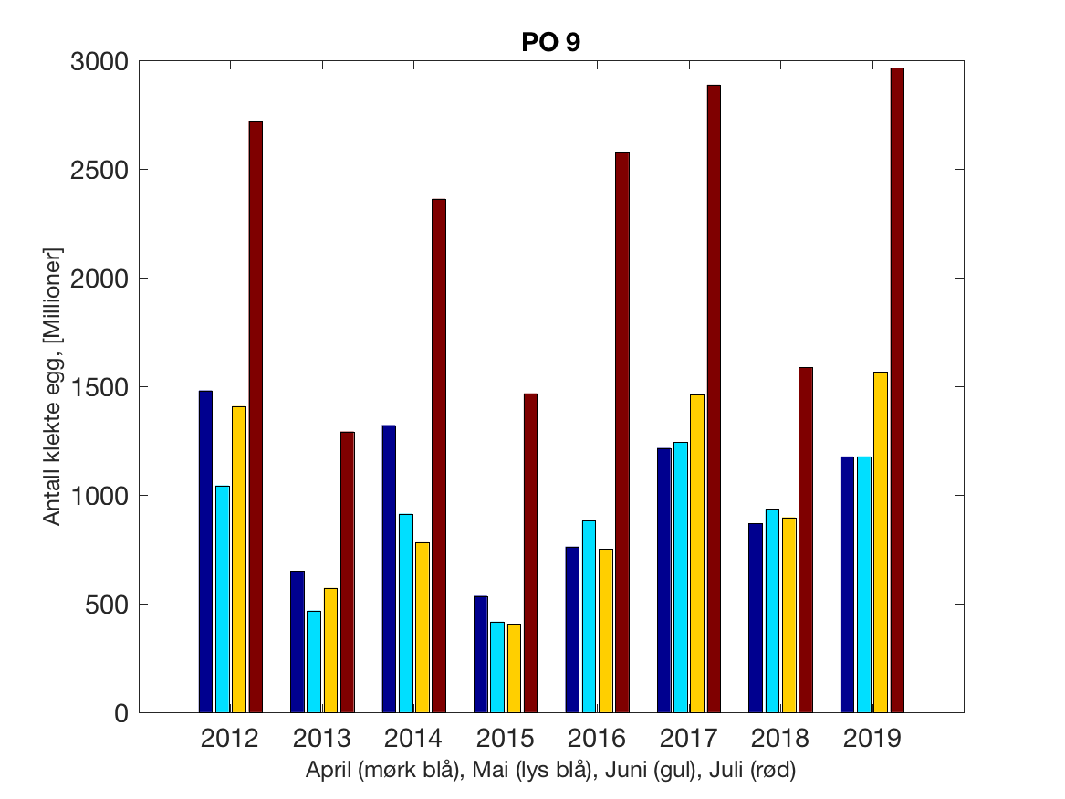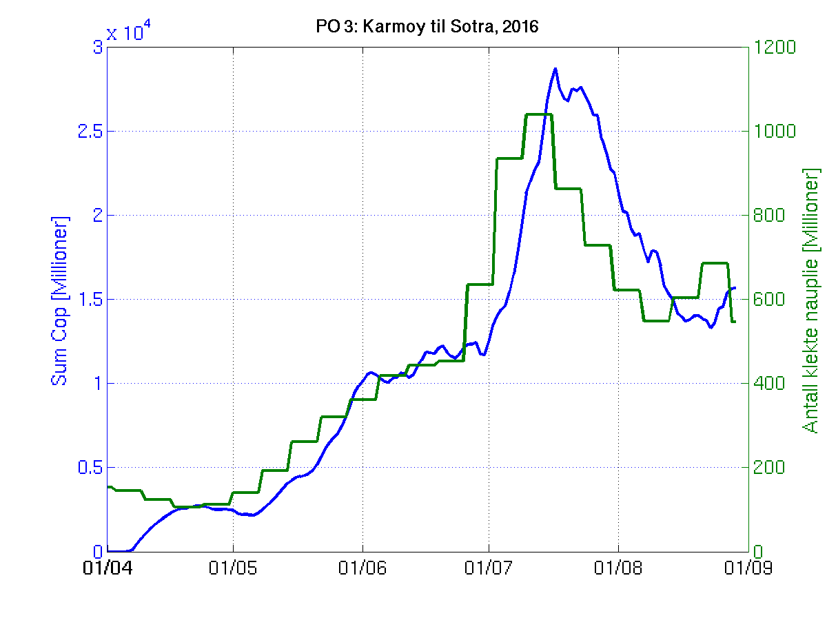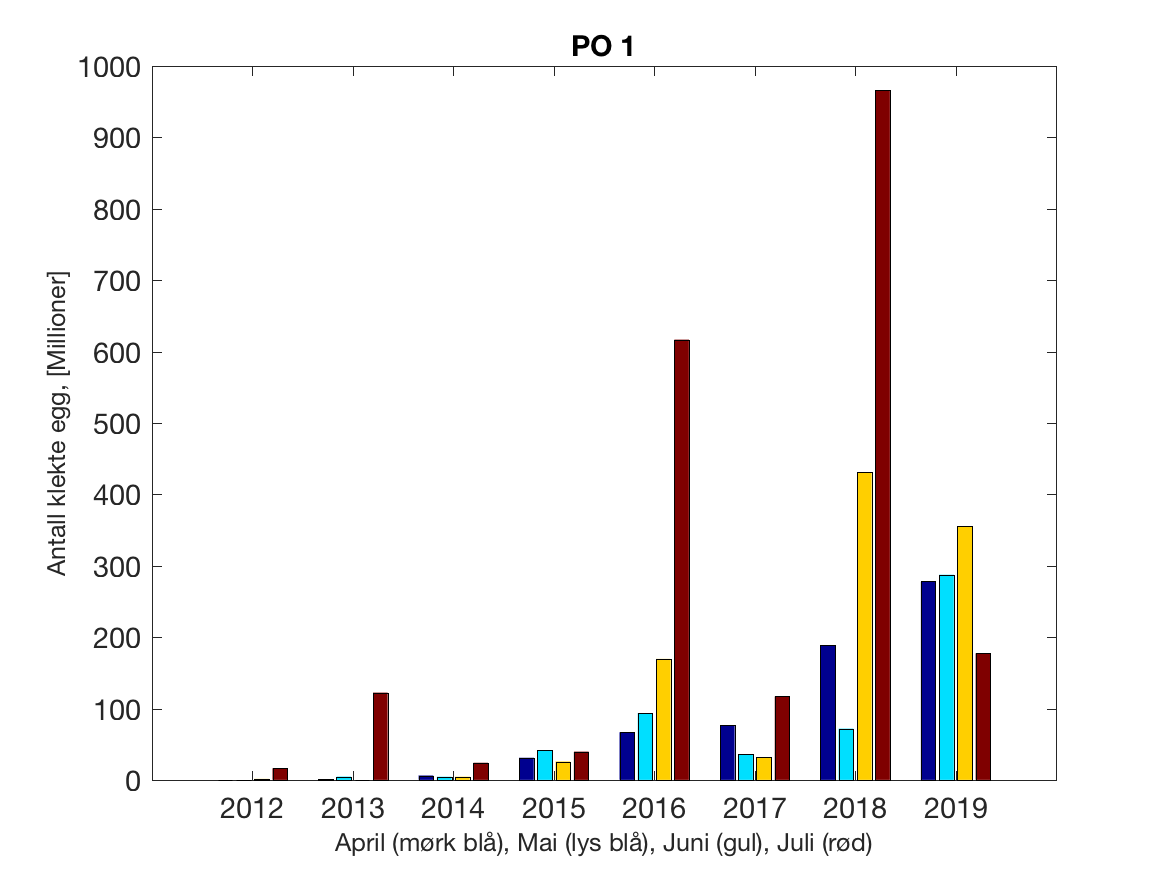 Siden grensene mellom produksjonsområdene er plassert slik at det skal være minimal utveksling av partikler mellom områdene vil summen av antall infektive kopepoditter følge klekkingen av nauplier (innen POet) med en tidsforsinkelse som er avhengig av vanntemperaturen, som vi kan se av eksempelet i Figur 1. I figur 2 er summen (per måned) av antall klekte nauplier per produksjonsområde plottet år for år. Merk at skalaen på y-aksen varierer mellom produksjonsområdene.