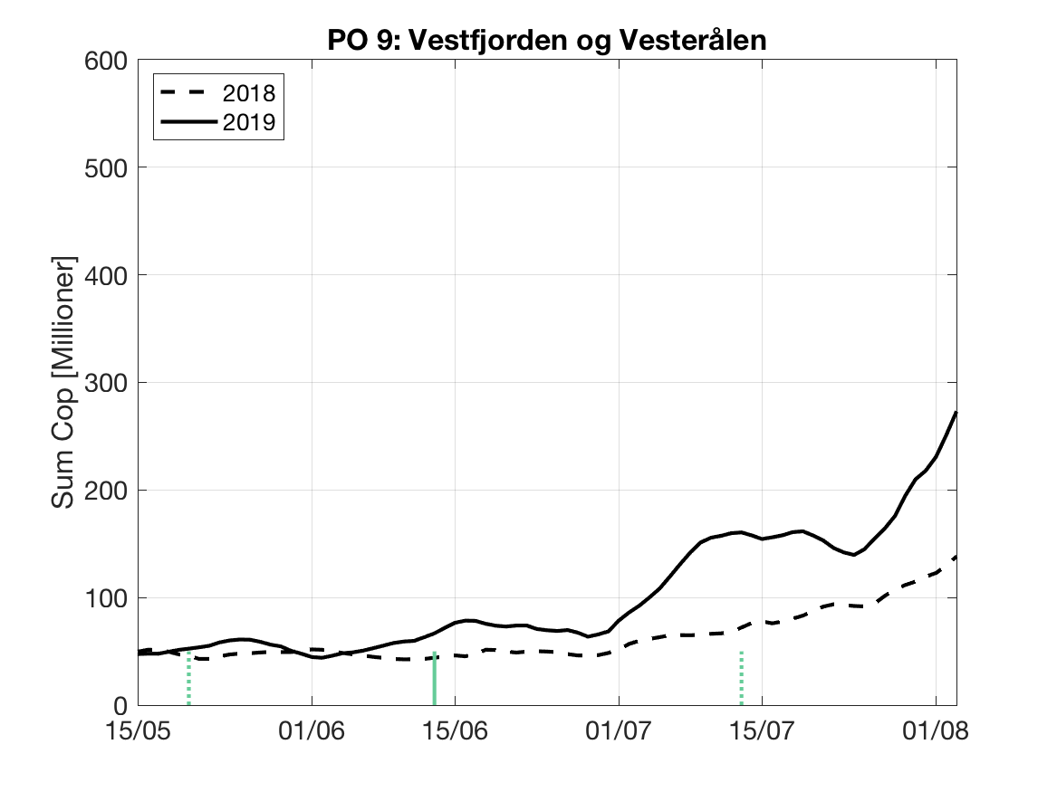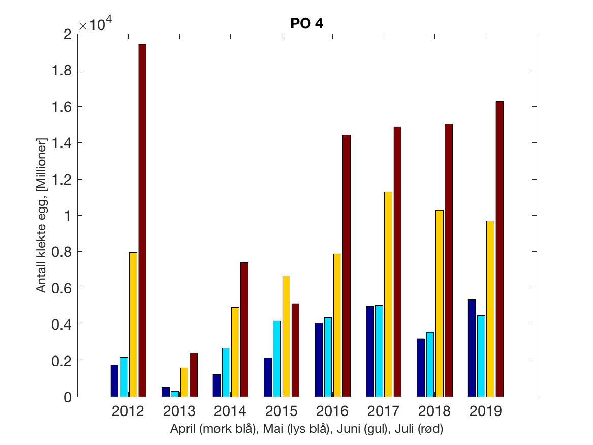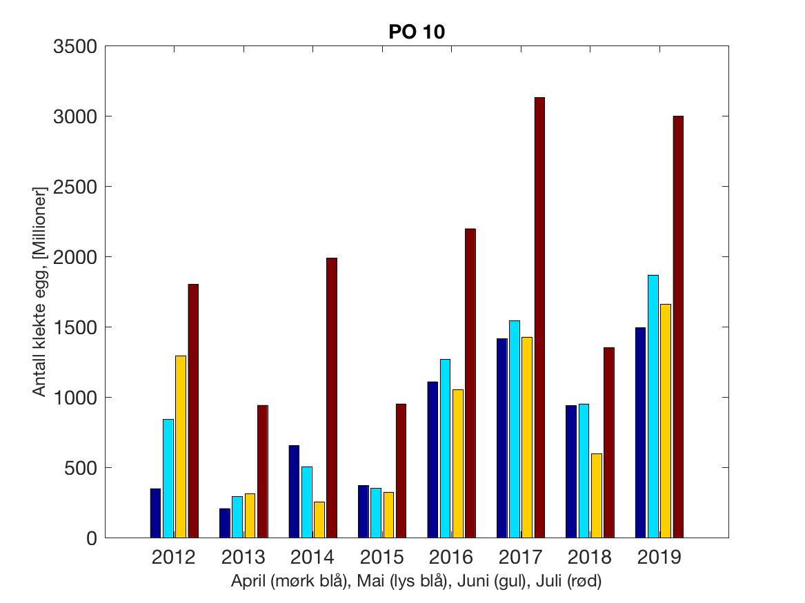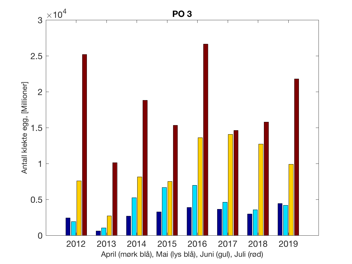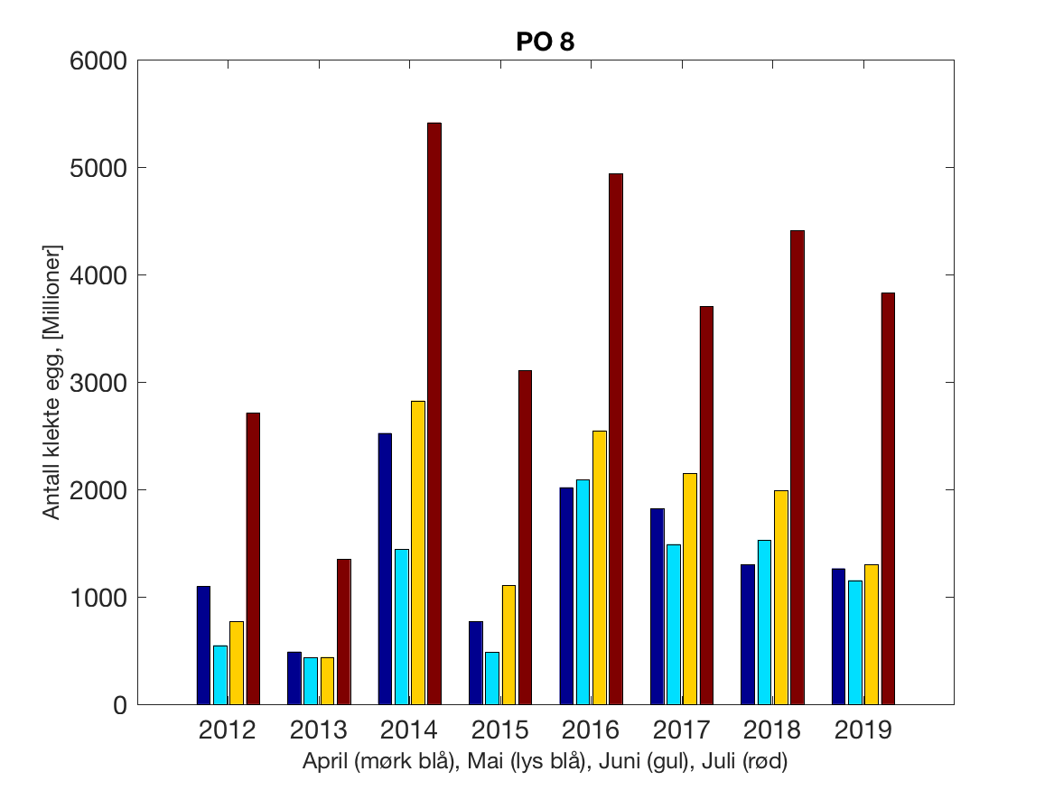 Siden grensene mellom produksjonsområdene er plassert slik at det skal være minimal utveksling av partikler mellom områdene vil summen av antall infektive kopepoditter følge klekkingen av nauplier (innen POet) med en tidsforsinkelse som er avhengig av vanntemperaturen, som vi kan se av eksempelet i Figur 1. I figur 2 er summen (per måned) av antall klekte nauplier per produksjonsområde plottet år for år. Merk at skalaen på y-aksen varierer mellom produksjonsområdene.