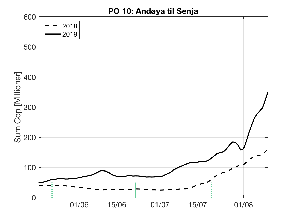 Simuleringene starter 2. mars 2019 for begge modellene og avsluttes på dag 121 som er 30. juni. Resultatene er presentert som døgnmiddel av tetthet, uttrykt som antall kopepoditter pr. m² mellom overflaten og 2m dyp.