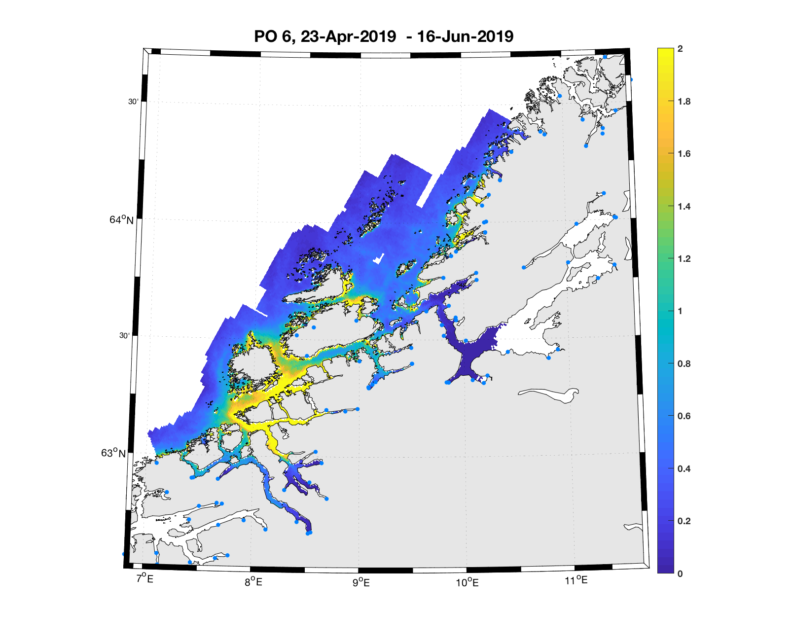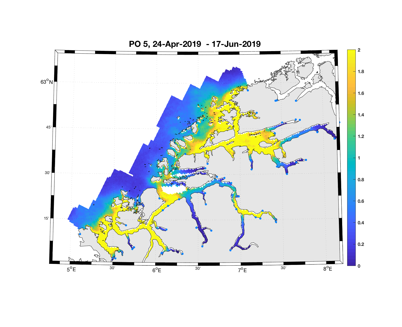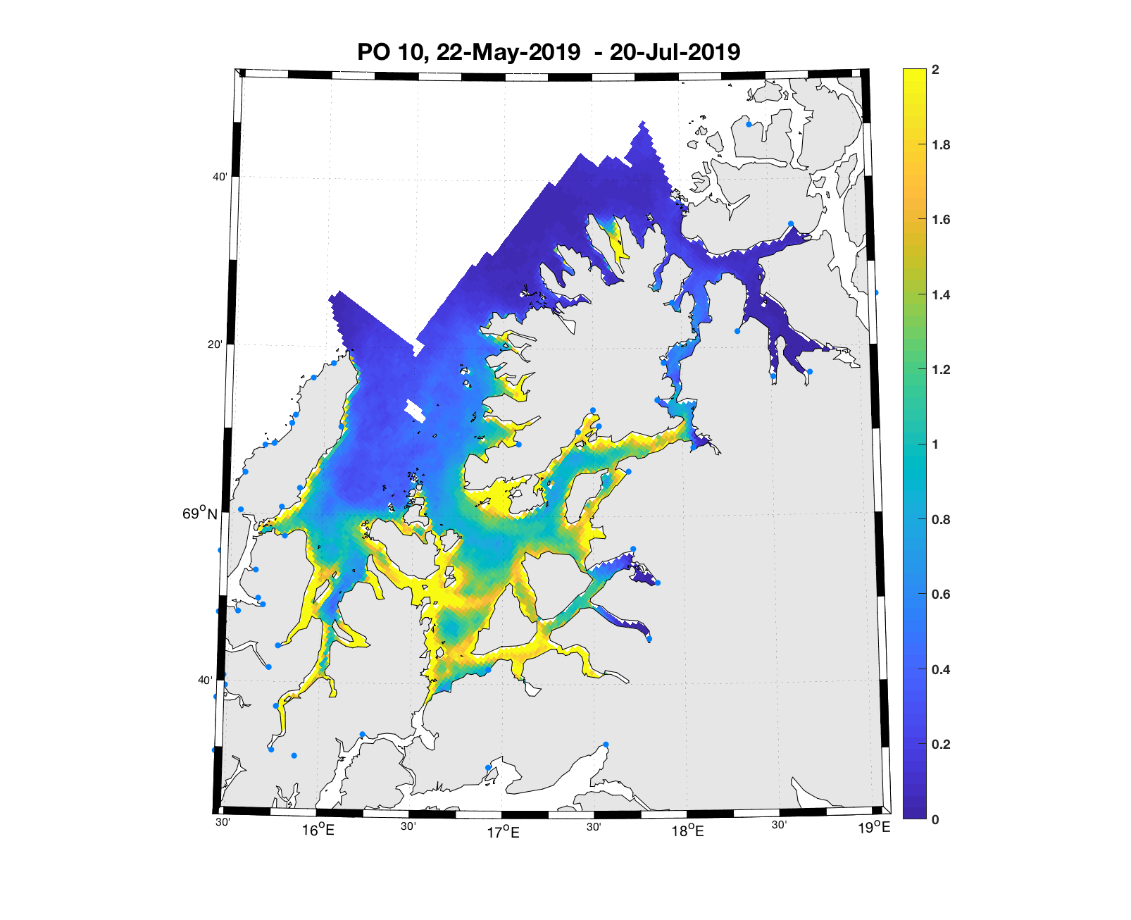 Denne typen resultater kan produseres for en hvilken som helst periode der vi har modellresultater for strøm, samt reelle estimat på hvor mange lakselus-nauplier som slippes ut (kildeleddet, beskrevet i 3.2). Konsistent informasjon om antall lus på fisk i anlegg finnes tilbake til 2012, og Havforskningsinstituttet har produsert et arkiv som inneholder geografisk fordeling av planktonisk lakselus time for time for perioden 1/3 – 1/9, 2012 til 2019. Dette arkivet oppdateres når for eksempel ny kunnskap om lakselusens biologi er tilgjengelig, slik at best mulige data kan benyttes i rådgivningen. I tillegg produseres det ukentlig 10-dagers gjennomsnittsverdier som publiseres på Havforskningsinstituttets webside www.lakselus.no .