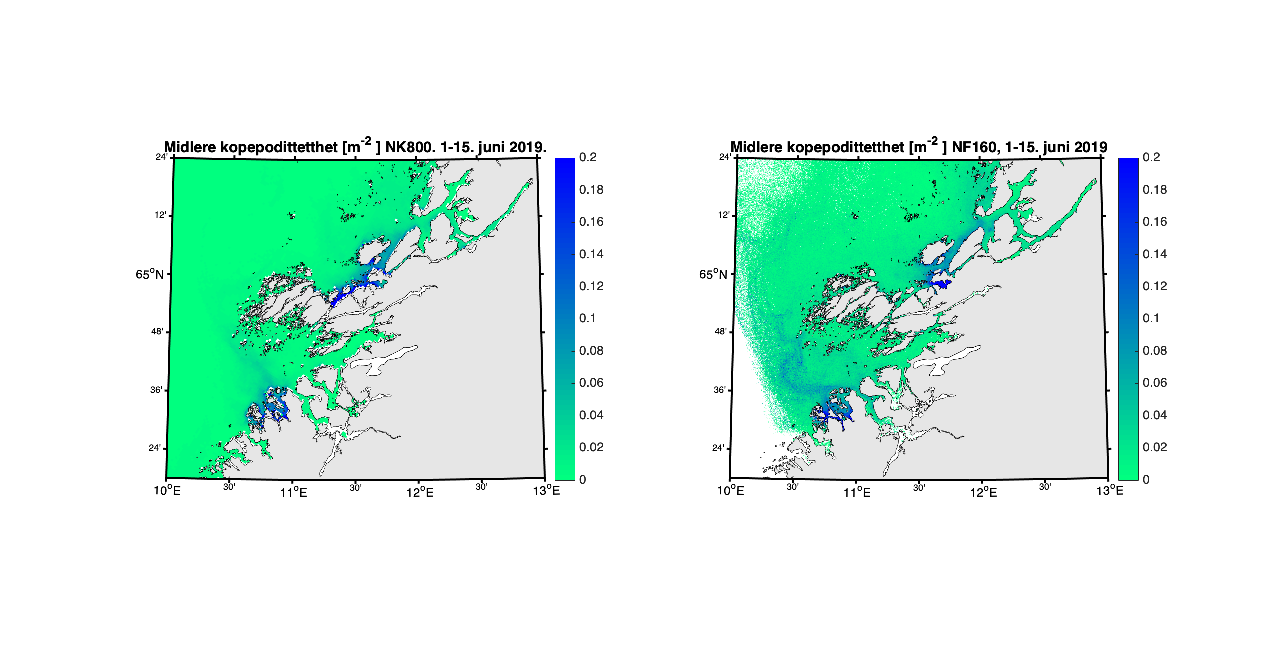 Figur 12. Kopepodittetthet for NorKyst800 (venstre) og NorFjords160 (høyre) for 1-15. juni, 2019.