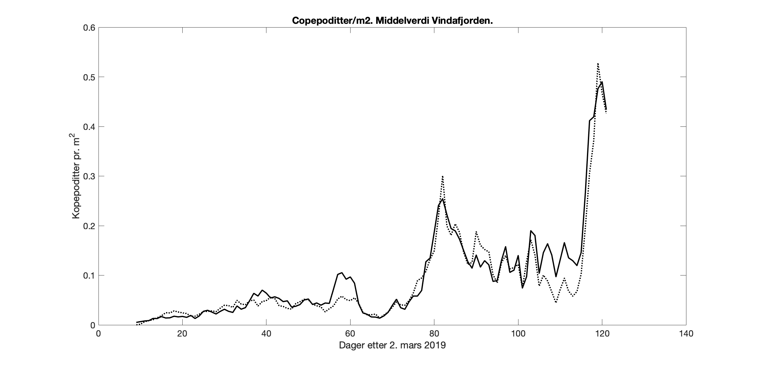 Figur 7. Middelverdi av kopepodittetthet for arealet i Vindafjorden for 800m-modellen (prikket linje) og 160m-modellen (heltrukket linje).